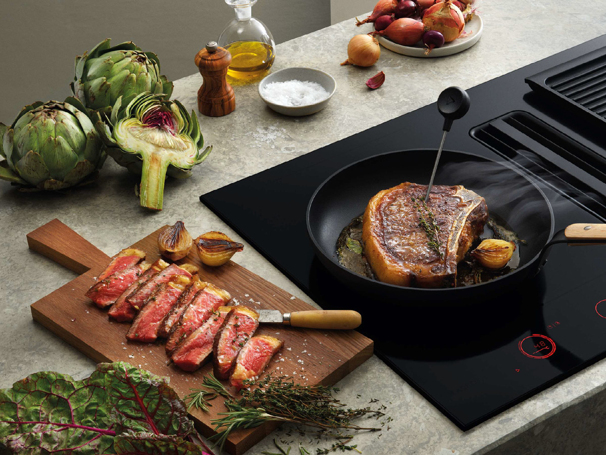 Czy nie byłoby wspaniale mieć czujnik temperatury, który komunikuje się bezpośrednio z płytą, na której gotujesz? To część tego, co robi Celsius° Cooking™. Będzie komunikować się z systemem, aby śledzić, kiedy osiągnięta zostanie określona ustawiona temperatura, albo po prostu powiadomi na wyświetlaczu płyty o wewnętrznej temperaturze np. steku.