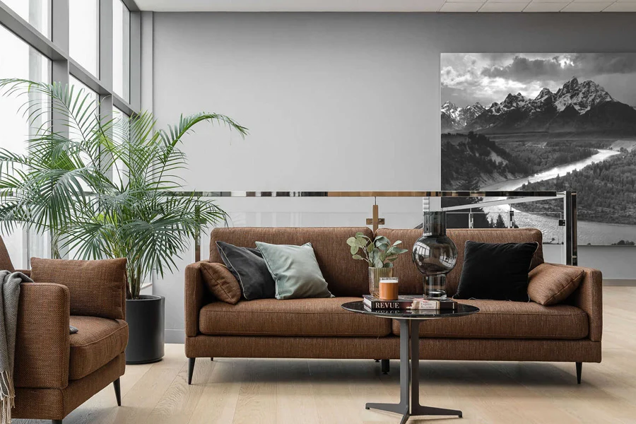 Jej znakiem rozpoznawczym jest miękka poduszka podłokietnikowa, osadzona w tapicerowanej bazie. Boki zakończone są od góry precyzyjnym łukiem, co pozwala poduszce subtelnie ugiąć się pod ciężarem ciała, zapewniając ergonomiczne podparcie i dopasowanie do pozycji użytkownika. Zastosowane w kolekcji zagłówki są regulowane, co umożliwia odpowiednie ustawienie wysokości oparcia także dla głowy. To rozwiązanie, które zwiększa komfort bez rezygnacji z nowoczesnej formy. Całość spoczywa na smukłych, metalowych nogach, które nadają sofie lekkości.