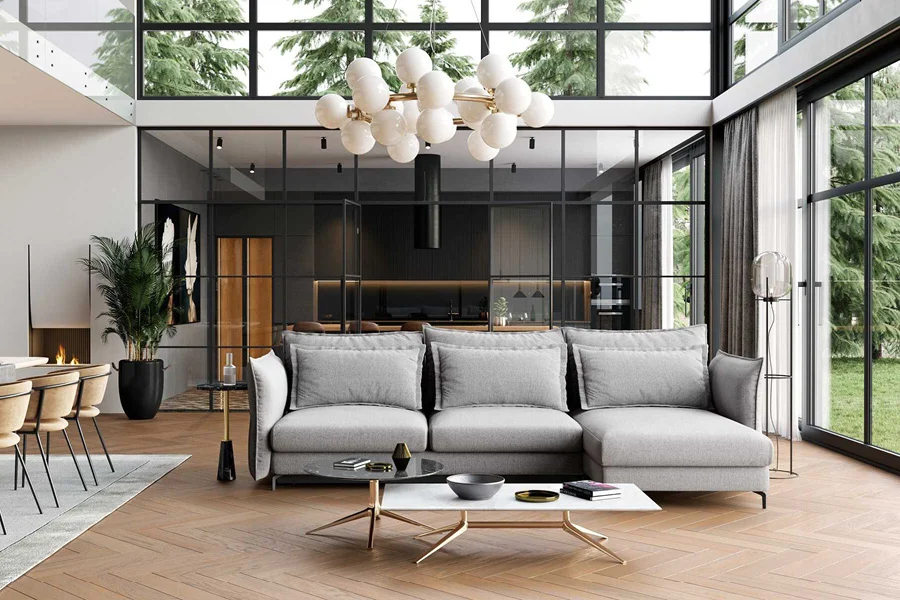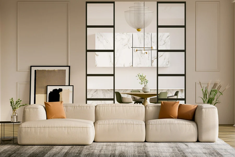 Salerno to modułowa kolekcja, która wyróżnia się charakterystyczną metalową płozą — to detal, który nadaje bryle współczesny, lekko industrialny sznyt. Jego forma jest lekka i wyważona, a całość spoczywa na horyzontalnej, tapicerowanej bazie. Siedziska są głębokie i miękkie. Dzięki starannie dobranemu wypełnieniu zapewniają trwałość i przyjemne uczucie otulenia. Eleganckie poduchy oparciowe zapraszają do odpoczynku. Cały układ buduje nie tylko komfort, ale też interesującą głębię wizualną. Kolekcja oferuje wiele możliwości konfiguracji. System modułowy obejmuje zarówno elementy narożne, szezlongi, jak i klasyczne siedziska, dlatego można ją łatwo dopasować do każdego wnętrza.