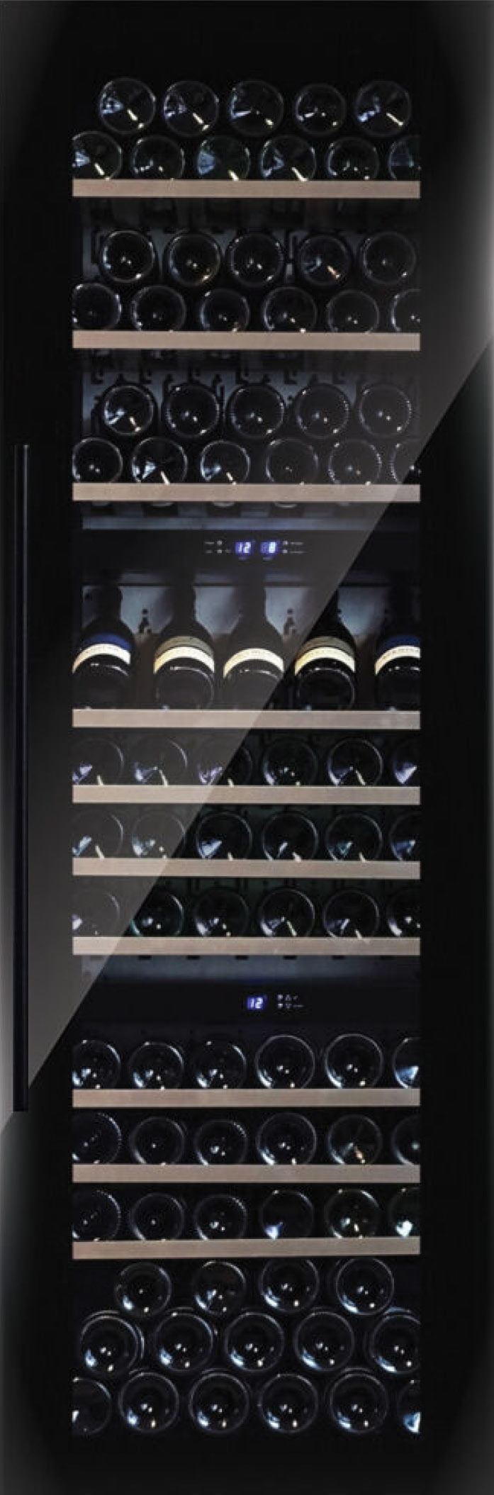 Czarne drzwi w całości ze szkła, drzwi z ramką w kolorze czarnym matowym lub ze stali nierdzewnej, drzwi z możliwością montażu panela meblowego aby idealnie wkomponować winiarkę w design Twojej kuchni i unikalna opcja – drzwi z ramką malowaną w dowolnie wybranym kolorze z palety RAL – wykończenia pasujące do każdego stylu lub koloru kuchni.