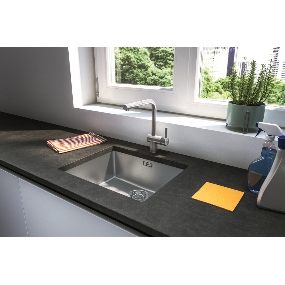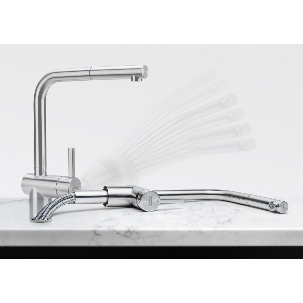 Bateria kuchenna, podokienna z wyciąganą wylewką Atlas Neo pull-out window w wykończeniu ze stali szlachetnej. Wyraziste, okrężne szczotkowanie baterii uwydatnia jej stalowy charakter. Innowacyjny, ruchomy przegub wyciąganej wylewki – zwiększa zakres ruchu i komfort pracy. Zakres ruchu dźwigni mieszacza 0°-90° ułatwia sterowanie strumieniem wody, również wtedy, kiedy bateria znajduje się blisko ściany. Innowacyjny strumień laminarny – specjalna konstrukcja aeratora zapewnia zwarty i krystaliczny strumień wody eliminujący rozpryski.