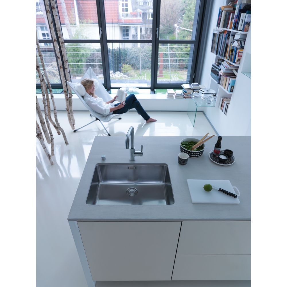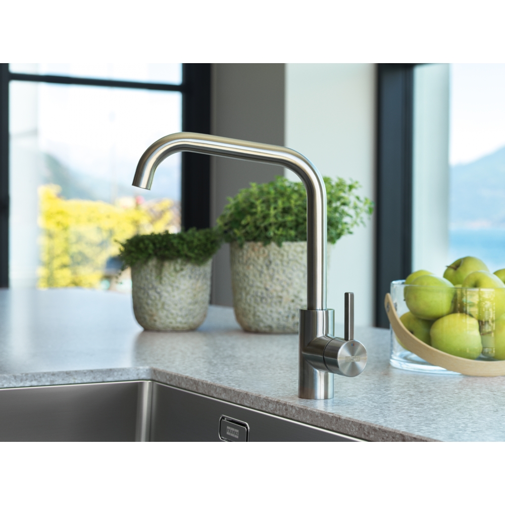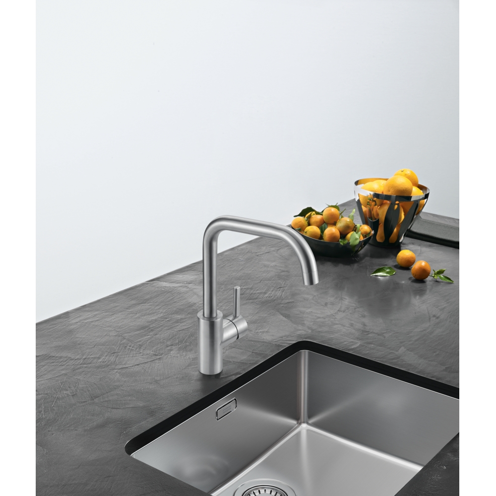 Bateria kuchenna ze stałą wylewką z serii Eos Neo U w wykończeniu ze stali szlachetnej. Zakres ruchu dźwigni mieszacza 0-90° ułatwia sterowanie strumieniem wody, również wtedy, kiedy bateria znajduje się blisko ściany. Posiada strumień laminarny – specjalna konstrukcja aeratora zapewnia zwarty strumień wody eliminujący rozpryski oraz ceramiczną głowicę, która jest niezawodna w kontakcie z wodą.