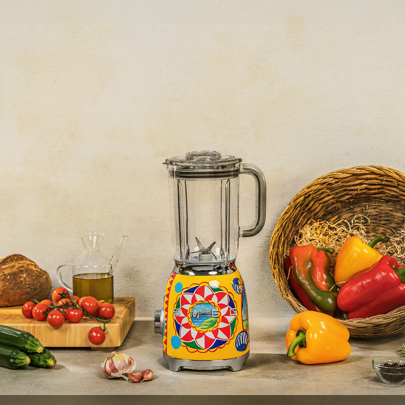 Blender kielichowy Smeg z serii 50’s Style w limitowanej edycji Sicily is my love projektu Dolce&Gabbana, 4 poziomy prędkości, max obroty/min 18000, pojemność dzbanka 1,5 l , 800 W.