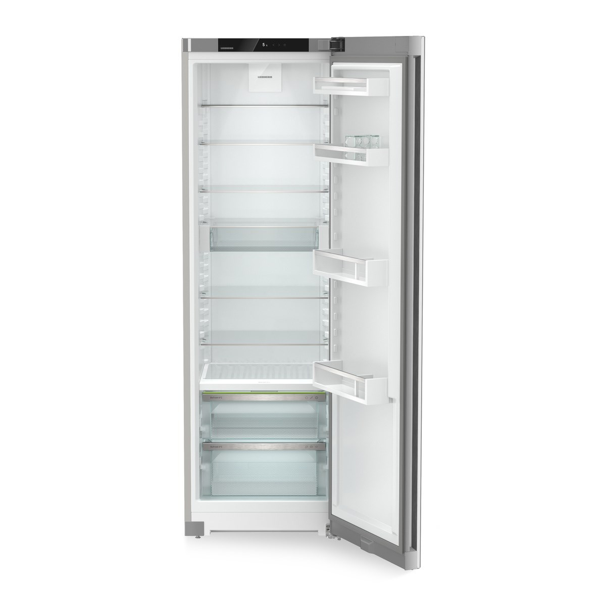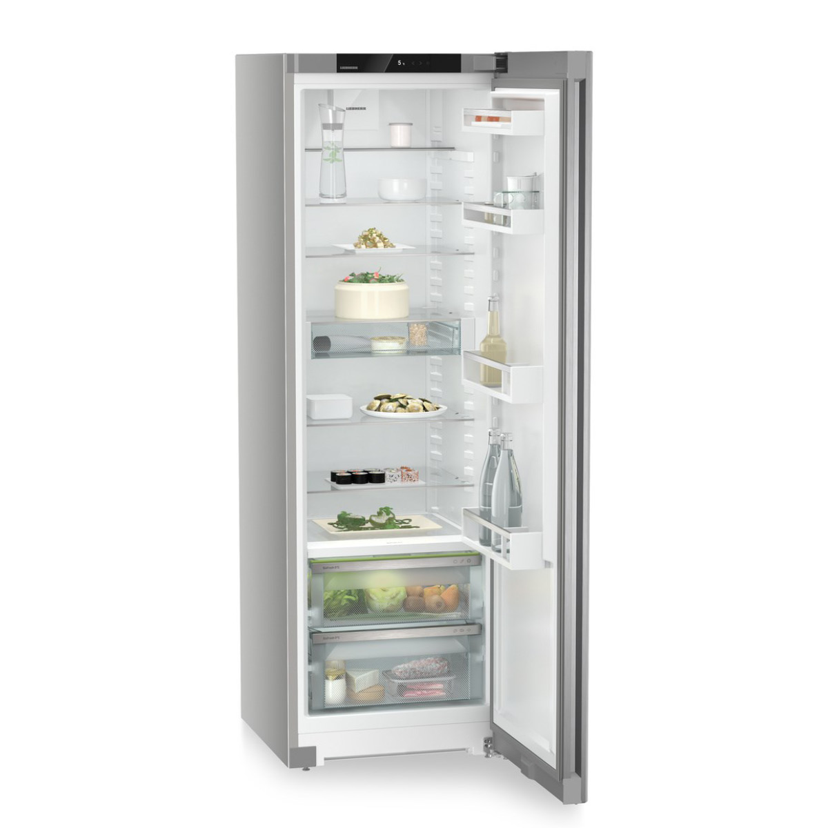 Alarm drzwi lodówki Liebherr chroni przed niepotrzebnym zużywaniem energii i zepsuciem jedzenia: gdy drzwi lodówki pozostaną otwarte zbyt długo, alarmuje użytkownika pulsującym światłem i dźwiękiem ostrzegawczym. O tym, co znaczy „zbyt długo”, możesz zdecydować samodzielnie: w zależności od ustawienia alarm drzwi uruchamia się po upływie 1, 2 lub 3 minut.