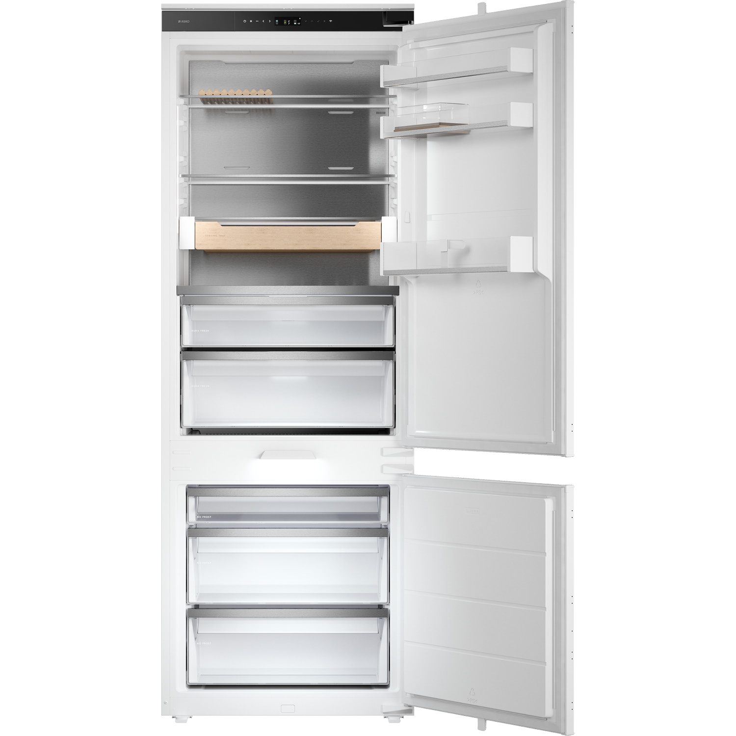 Chłodziarko-zamrażarka do zabudowy ma przejrzysty i łatwy w obsłudze kolorowy wyświetlacz dotykowy oraz połączone WIFI do aplikacji ConnectLife. Unikalne szuflady Dura Fresh mają indywidualną kontrolę temperatury i automatyczną kontrolę wilgotności, co tworzy idealne warunki dla świeżej żywności. Szuflady w chłodziarce i zamrażarce łatwo przesuwają się na teleskopowych szynach, a zamrażarka ma funkcję No Frost, która eliminuje potrzebę rozmrażania.