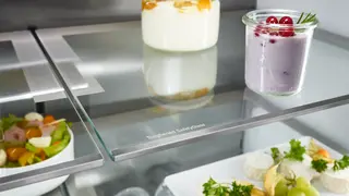 - System wysuwu szuflad w komorze chłodniczej: całkowicie wysuwane wyciągi na szynach teleskopowych z samoczynnym zamykaniem i tłumieniem zamykania