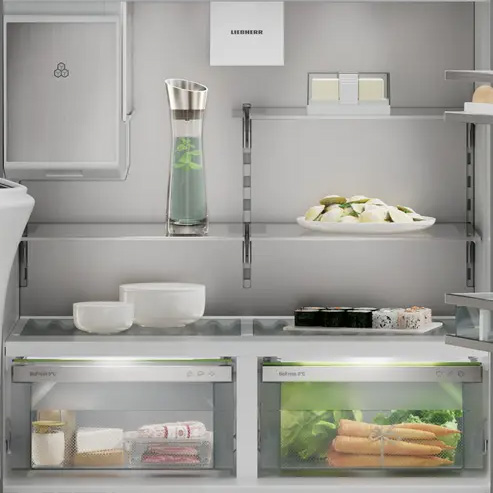 - System wysuwu szuflad w komorze chłodniczej: całkowicie wysuwane wyciągi na szynach teleskopowych z samoczynnym zamykaniem i tłumieniem zamykania