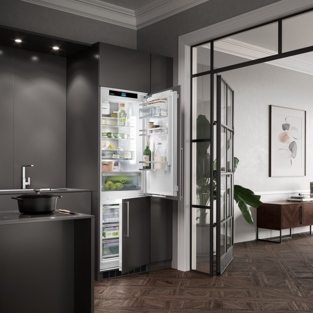 Chłodziarko-zamrażarka z serii PRIME do zintegrowanej zabudowy z technologią EasyFresh i NoFrost oraz modułem SmartDeviceBox w zestawie.