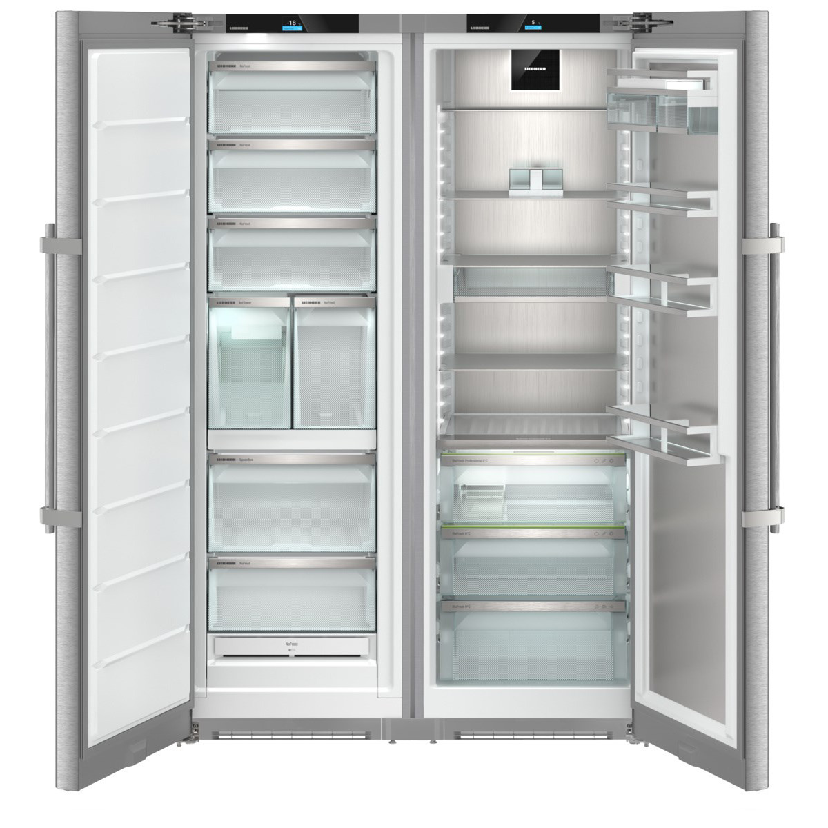 Zestaw Side-by-Side wolnostojący: zamrażarka szufladowa SFNstd 529i Peak NoFrost z chłodziarką SRBstc 529i Peak BioFresh Professional.