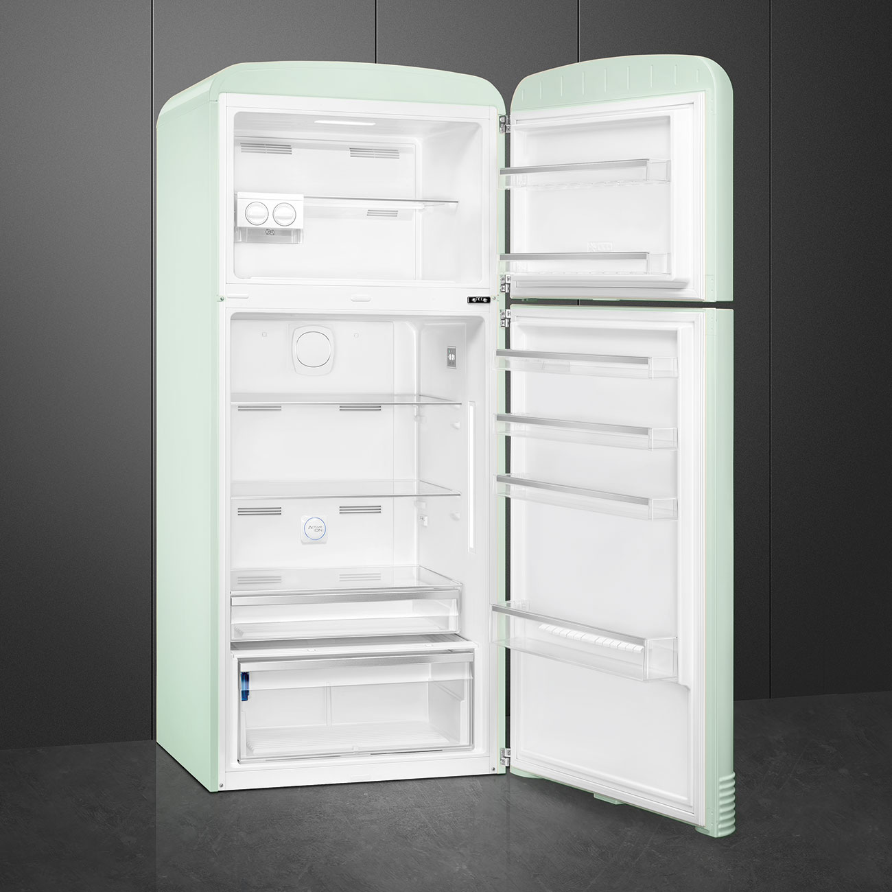 Chłodziarko-zamrażarka wolnostojąca z serii 50’s Style w kolorze pastelowej zieleni, kostkarka ręczna, oświetlenie LED, dwudrzwiowa, No Frost, podwójny system chłodzenia, 5-letnia gwarancja, h=192 cm.