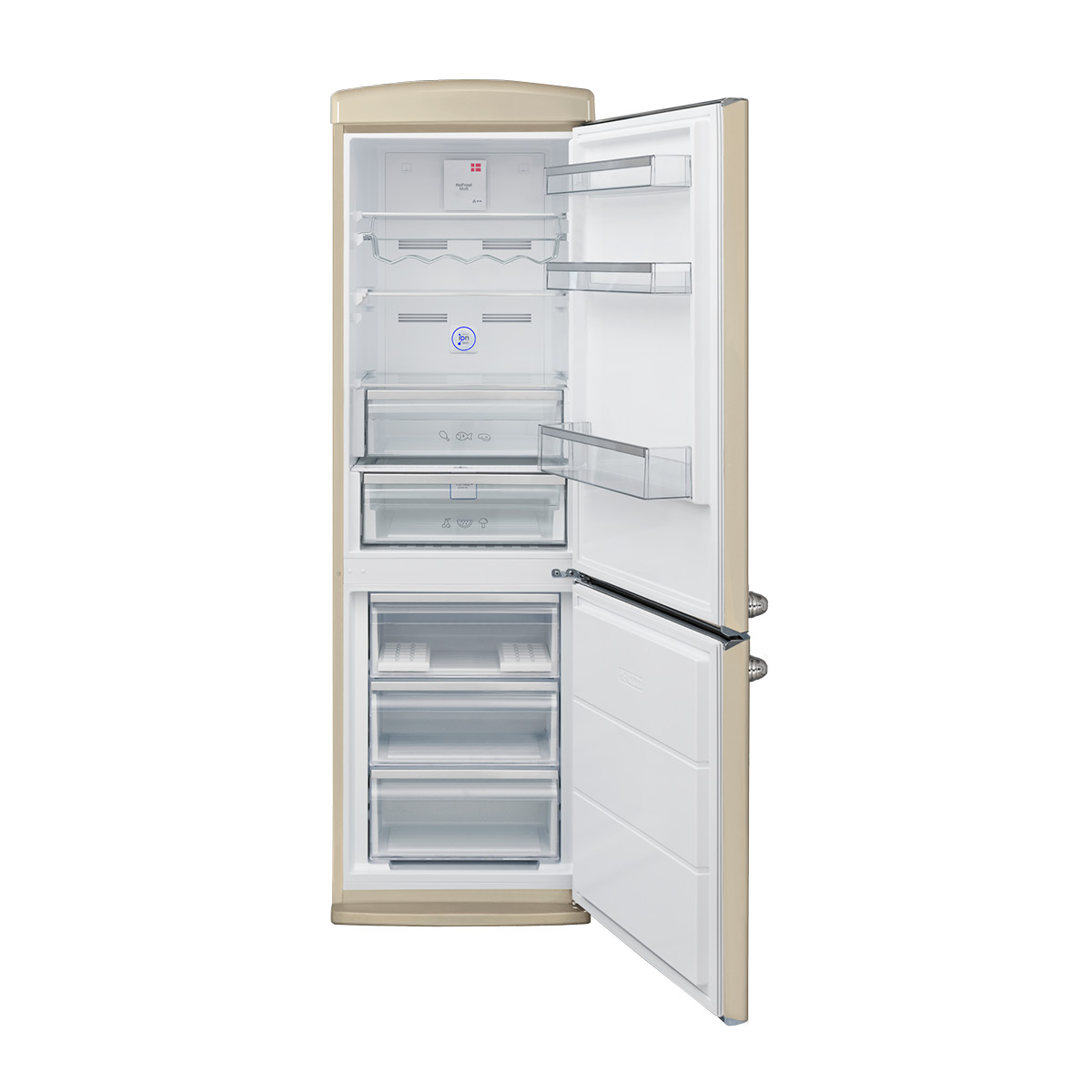 Chłodziarko-zamrażarka wolnostojąca w kolorze beżowym z kolekcji Retro, NoFrost Multi, Maxi Fresh, Ion Tech, h=190 cm.