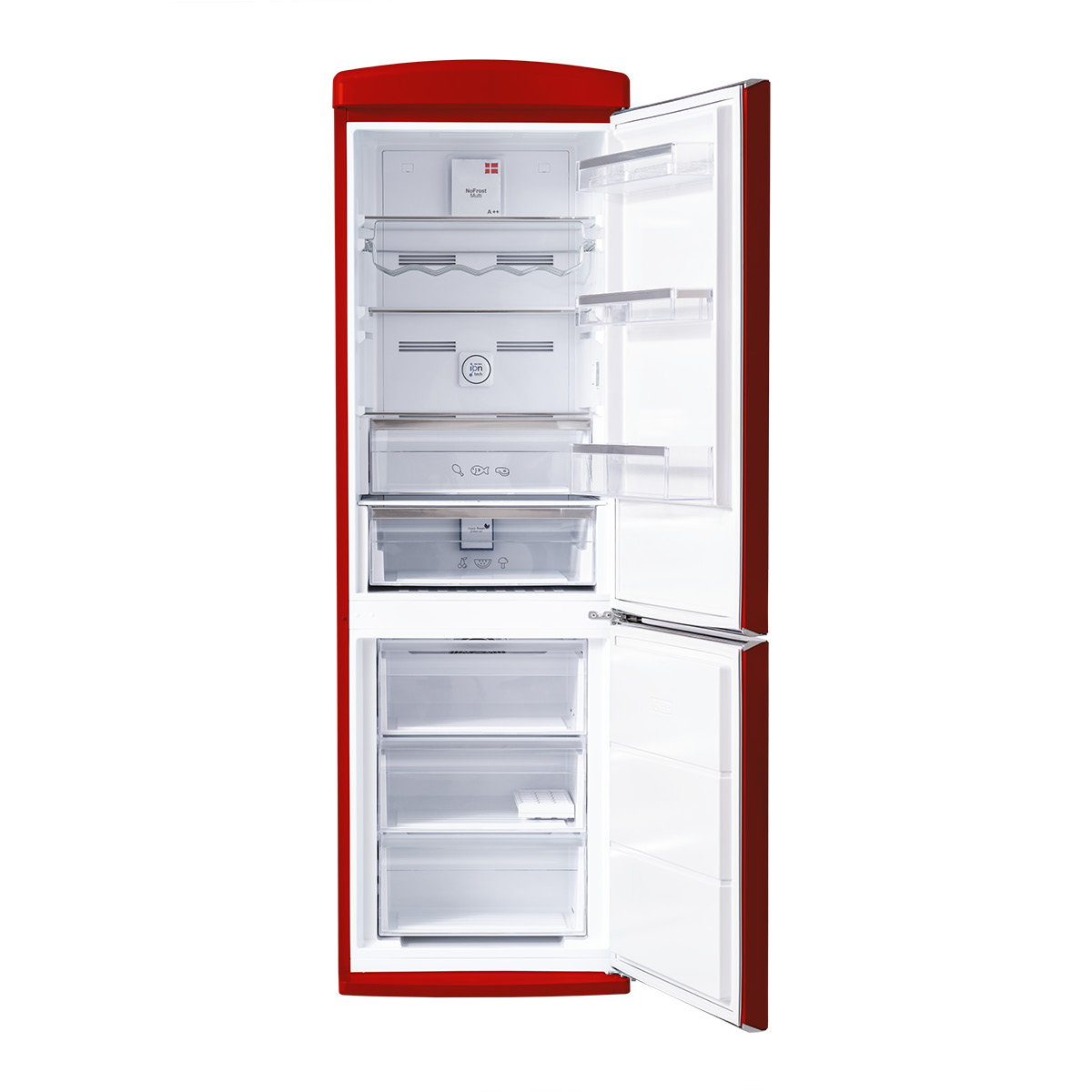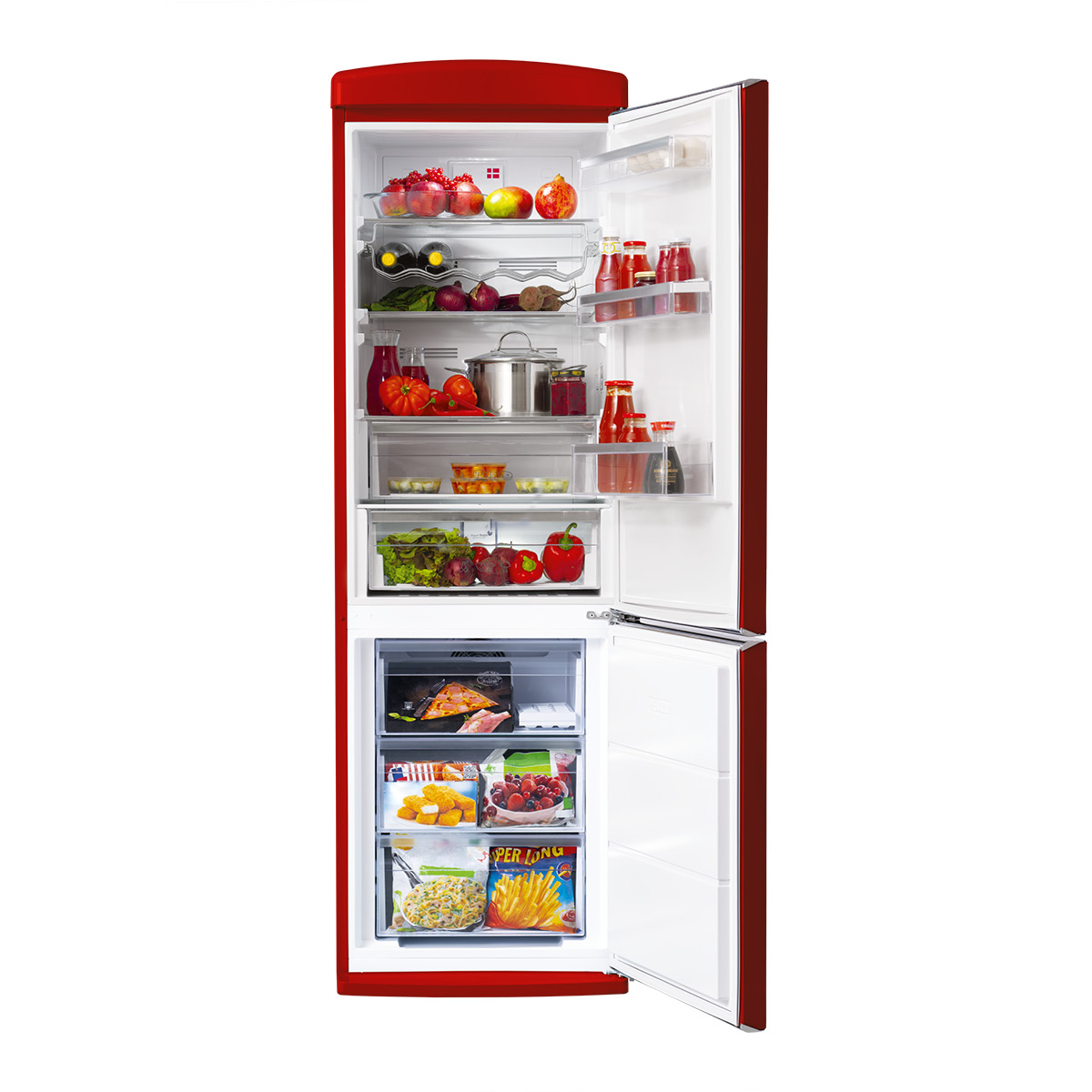 Chłodziarko-zamrażarka wolnostojąca w kolorze czerwonym z kolekcji Retro, NoFrost Multi, Maxi Fresh, Ion Tech, h=190 cm.