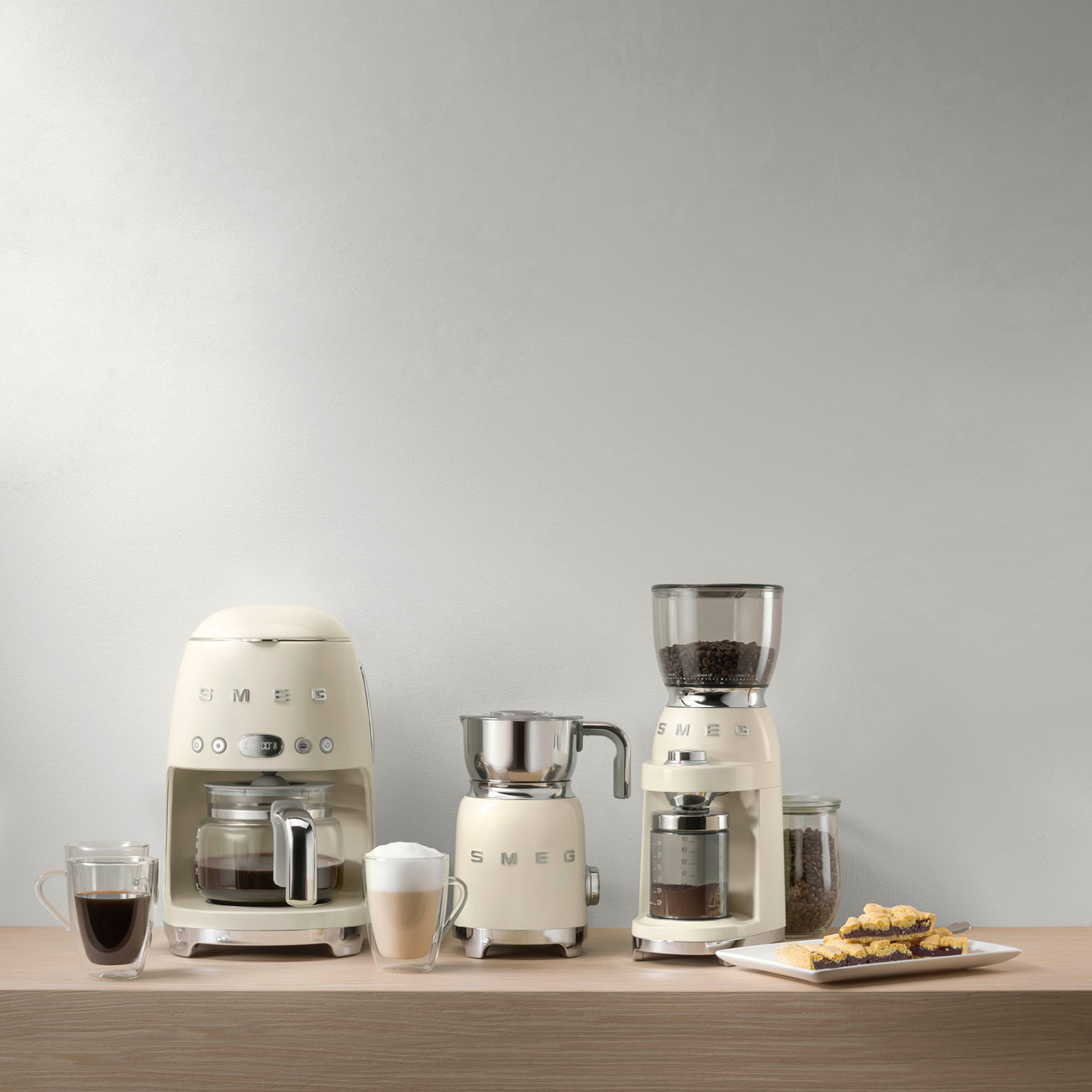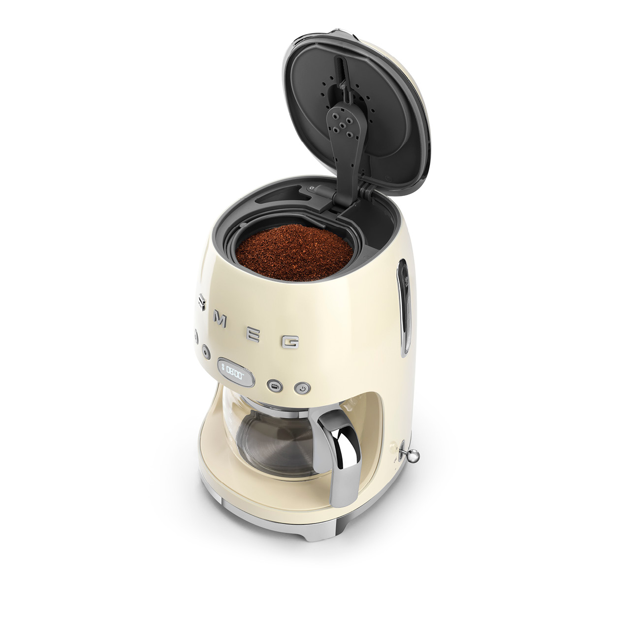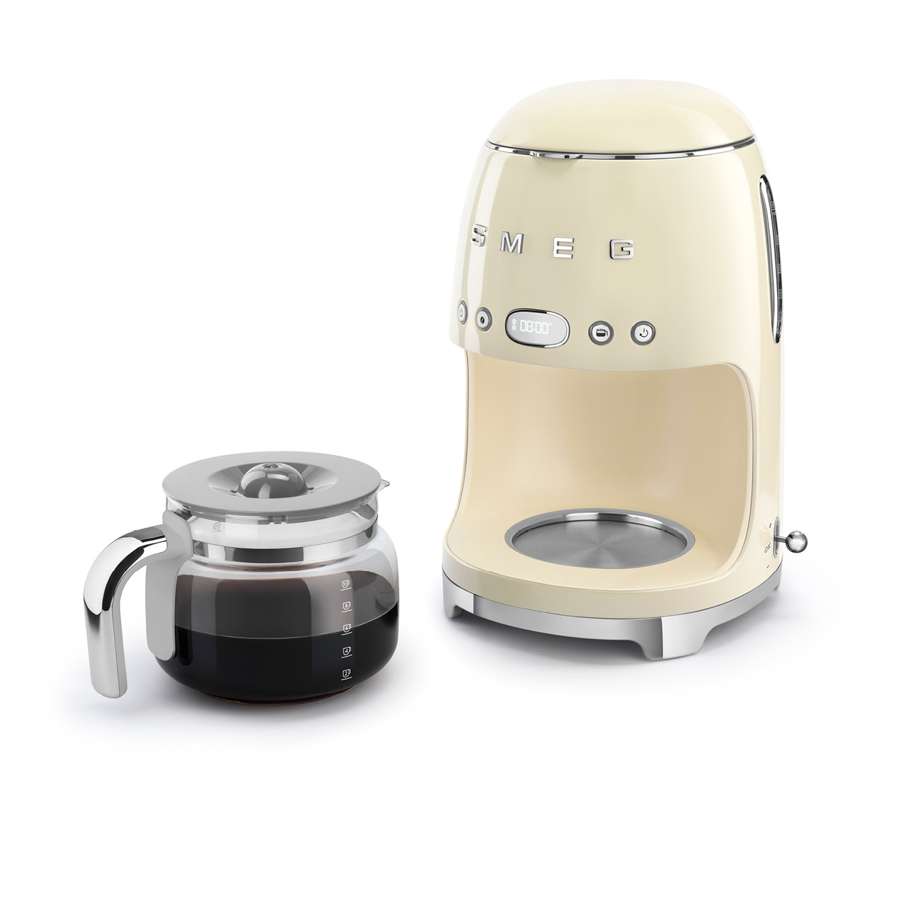 Ekspres przelewowy Smeg z serii 50’s Style w kolorze kremowym, regulowana twardość wody, regulacja mocy kawy, podtrzymywanie temperatury kawy, wyświetlacz LED, zbiornik na wodę 1,4 l, pojemność dzbanka 1,25 l, 1050 W.