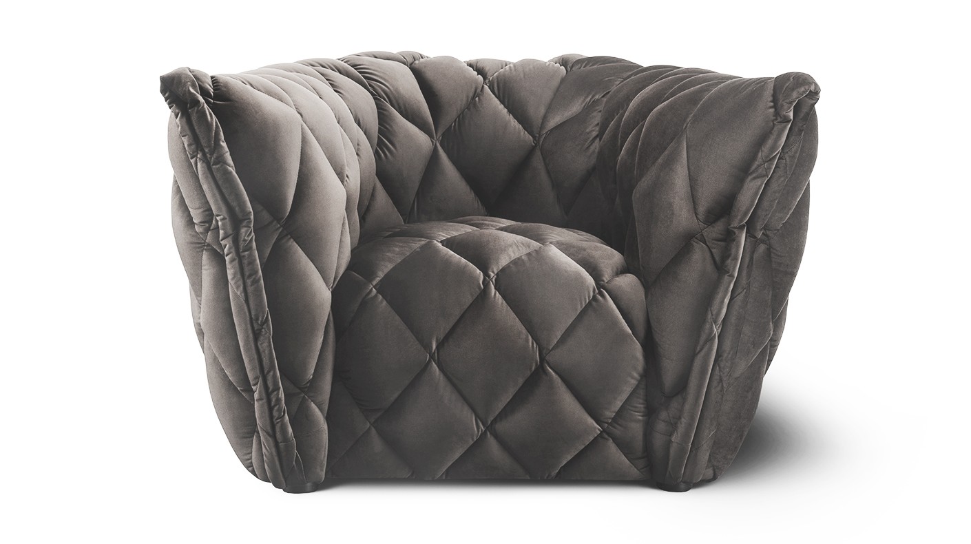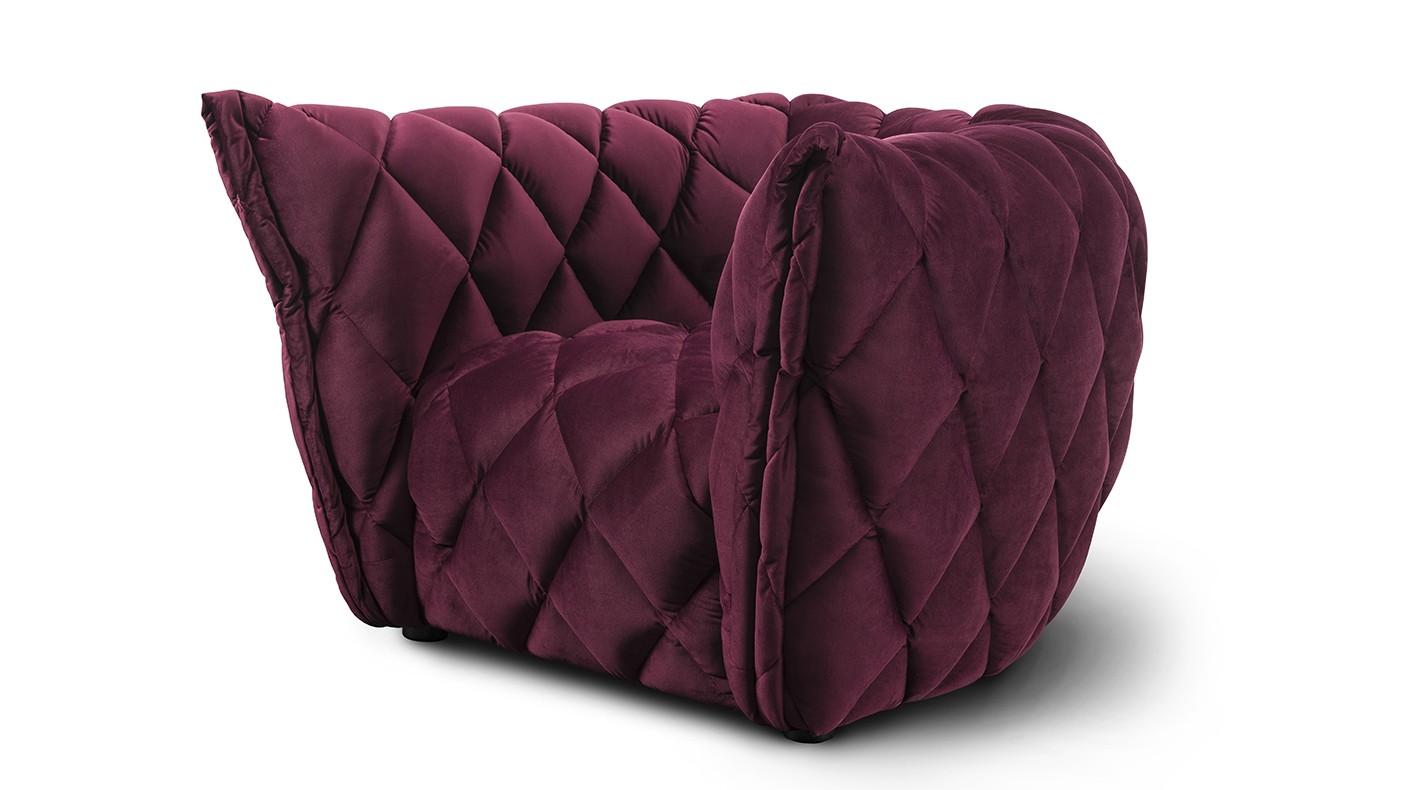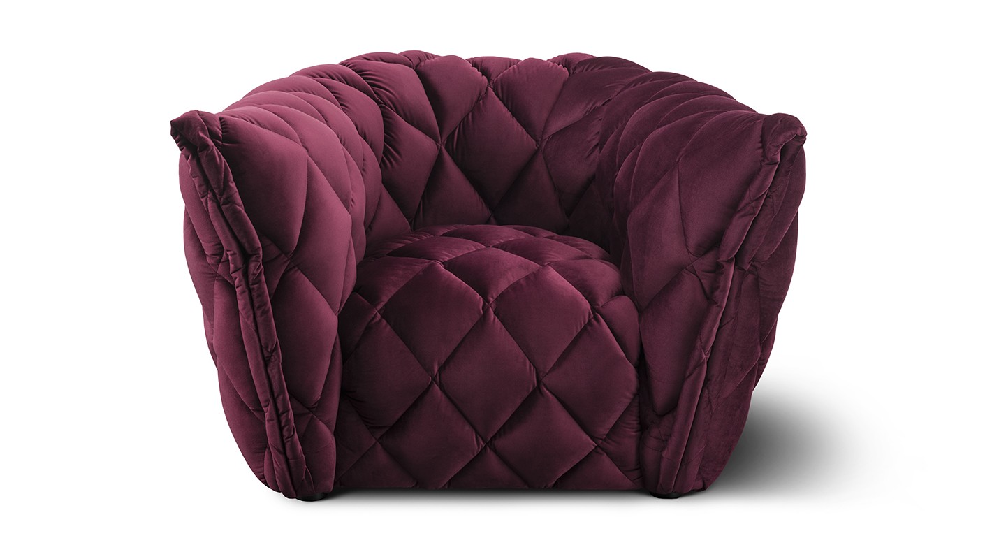 - Wysoka estetyka formy – świadczą o niej unikalne przeszycia w kształcie rombów oraz podłokietniki wykończone elegancką, grubą zakładką.