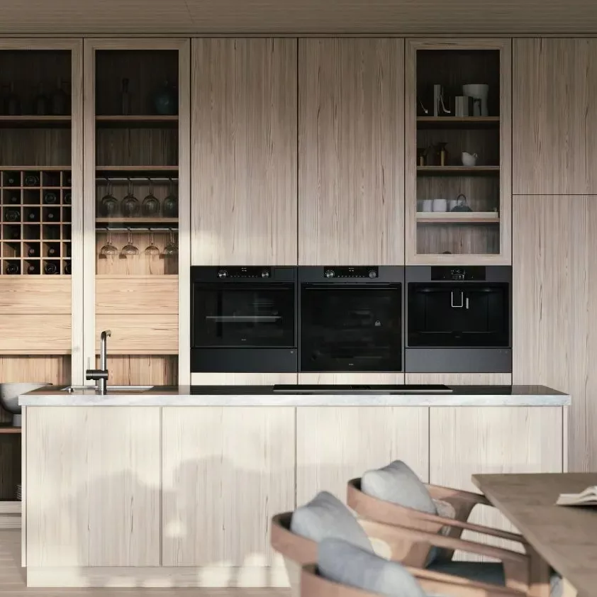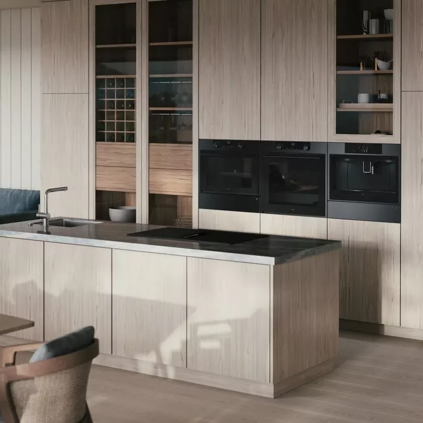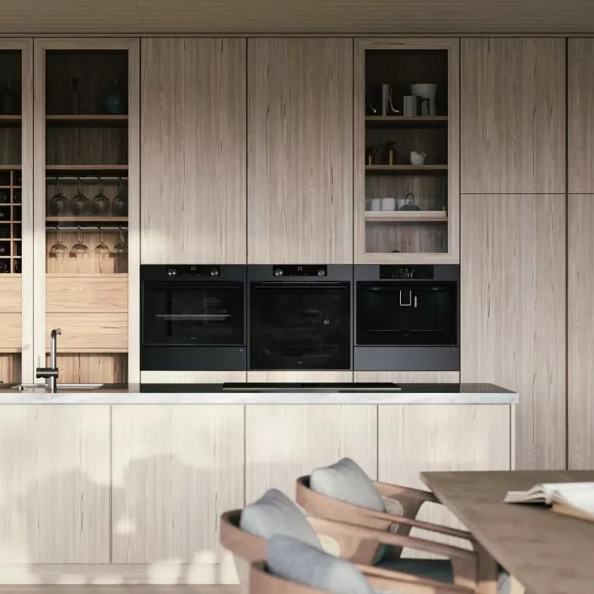Kawiarka do zintegrowanej zabudowy w kolorze czarnej stali (czarno-szara szczotkowana stal nierdzewna), kolorowy dotykowy wyświetlacz LCD, 15 bar, schowek na filiżanki, oświetlenie LED, automatyczne odkamienianie, regulacja temperatury kawy pary i wody.