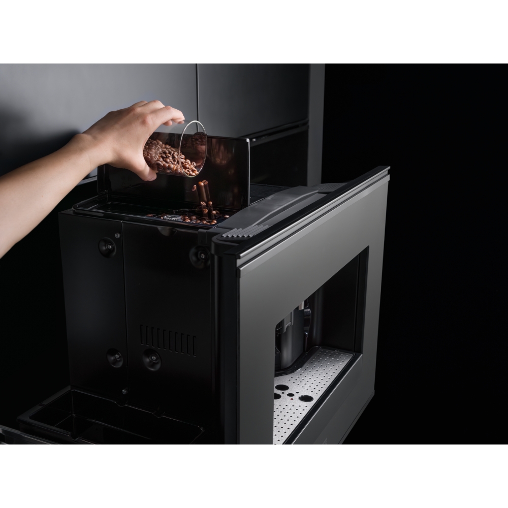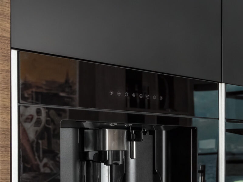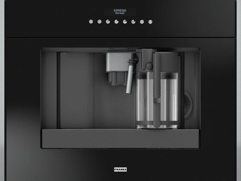 Ekspres do kawy Franke do zabudowy z serii Mythos z elementami wykończenia z czarnej stali.