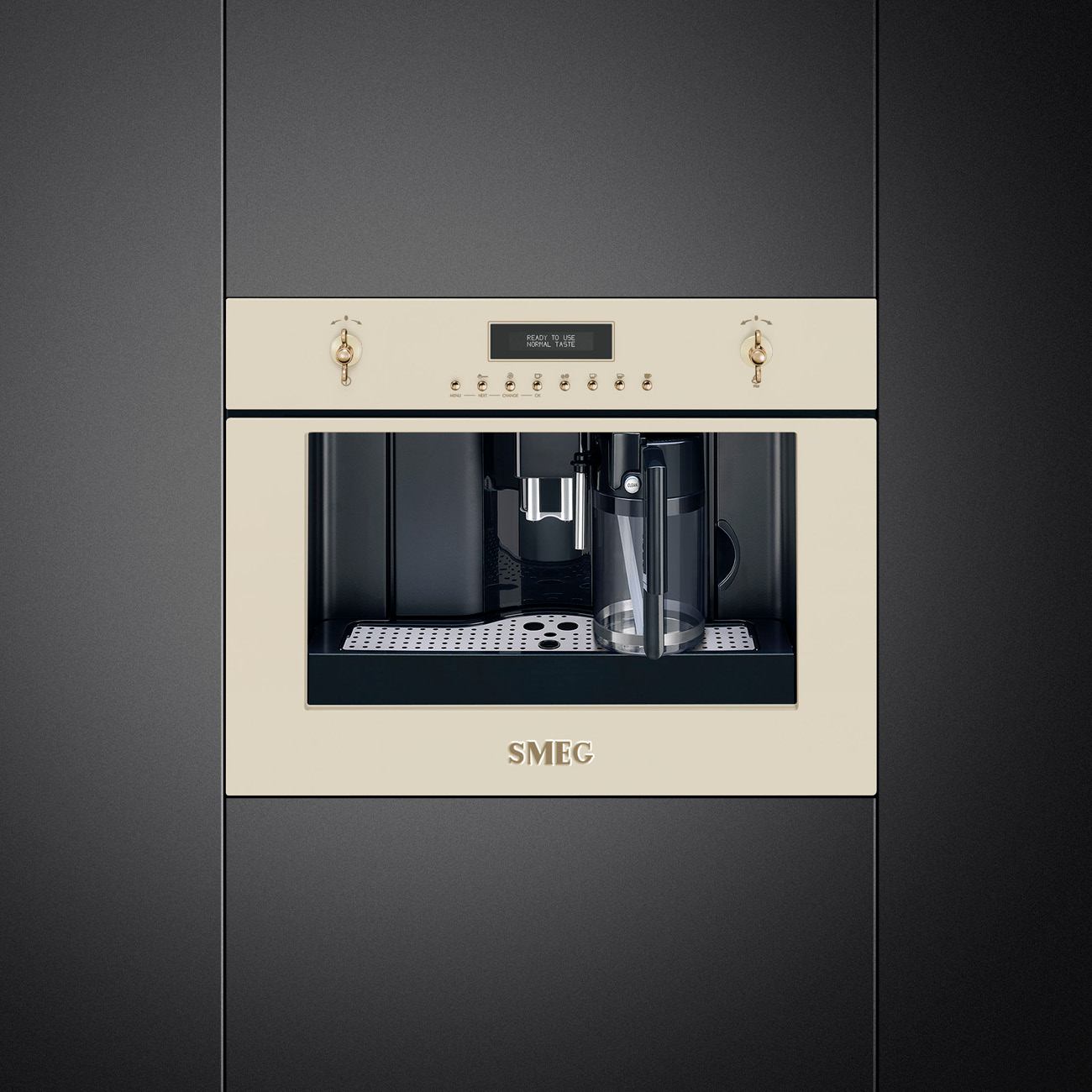Ekspres do kawy Smeg do zabudowy z serii Coloniale w kolorze kremowym, wyświetlacz LCD, oświetlenie LED, 15 bar, stalowy młynek stożkowy, z 5-letnią gwarancją producenta.