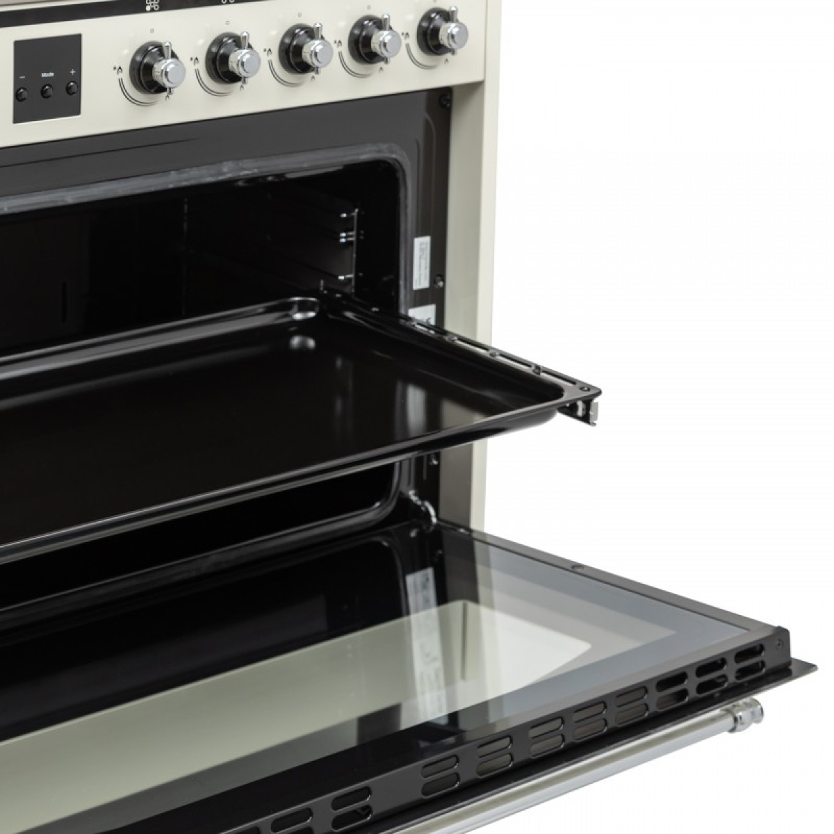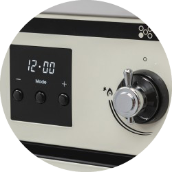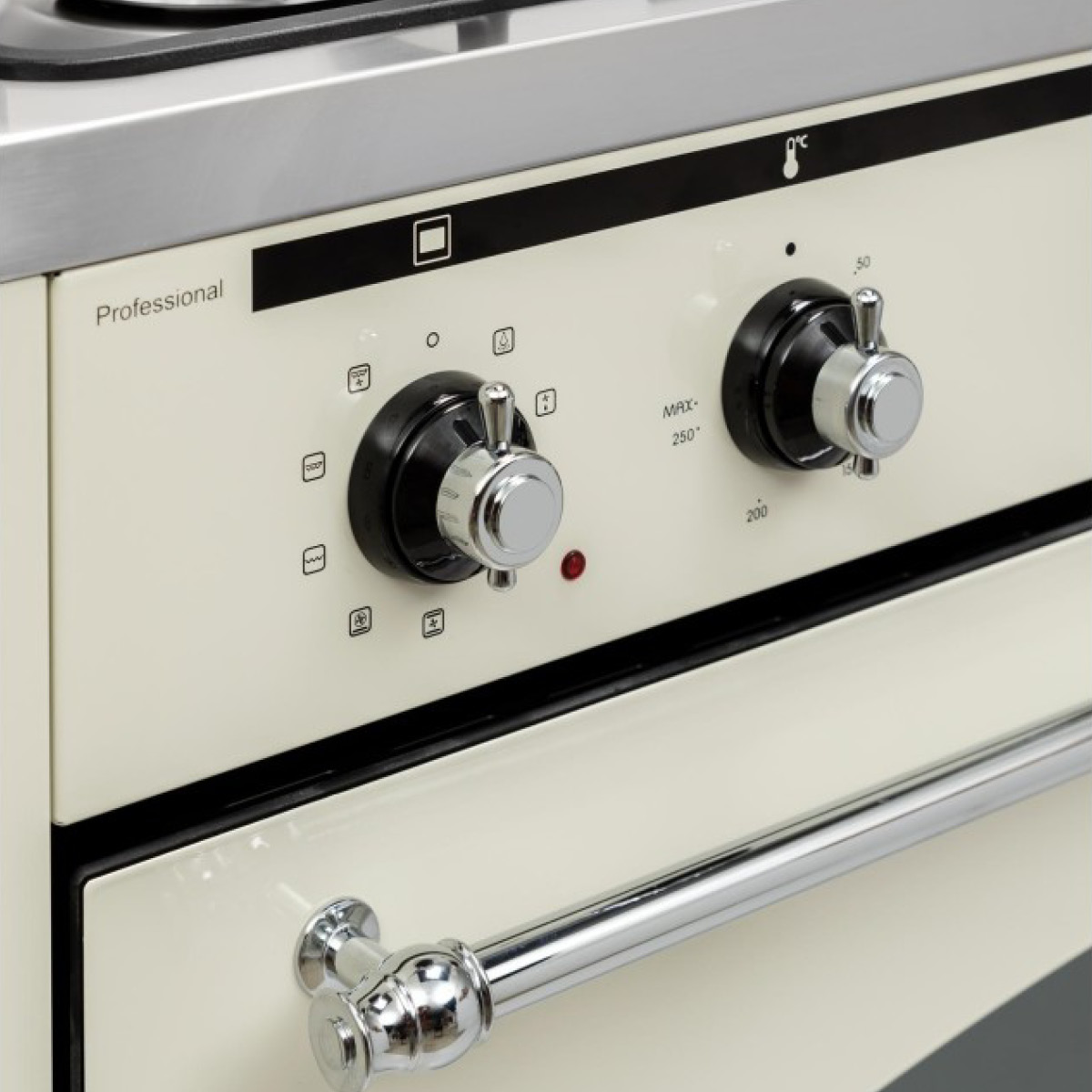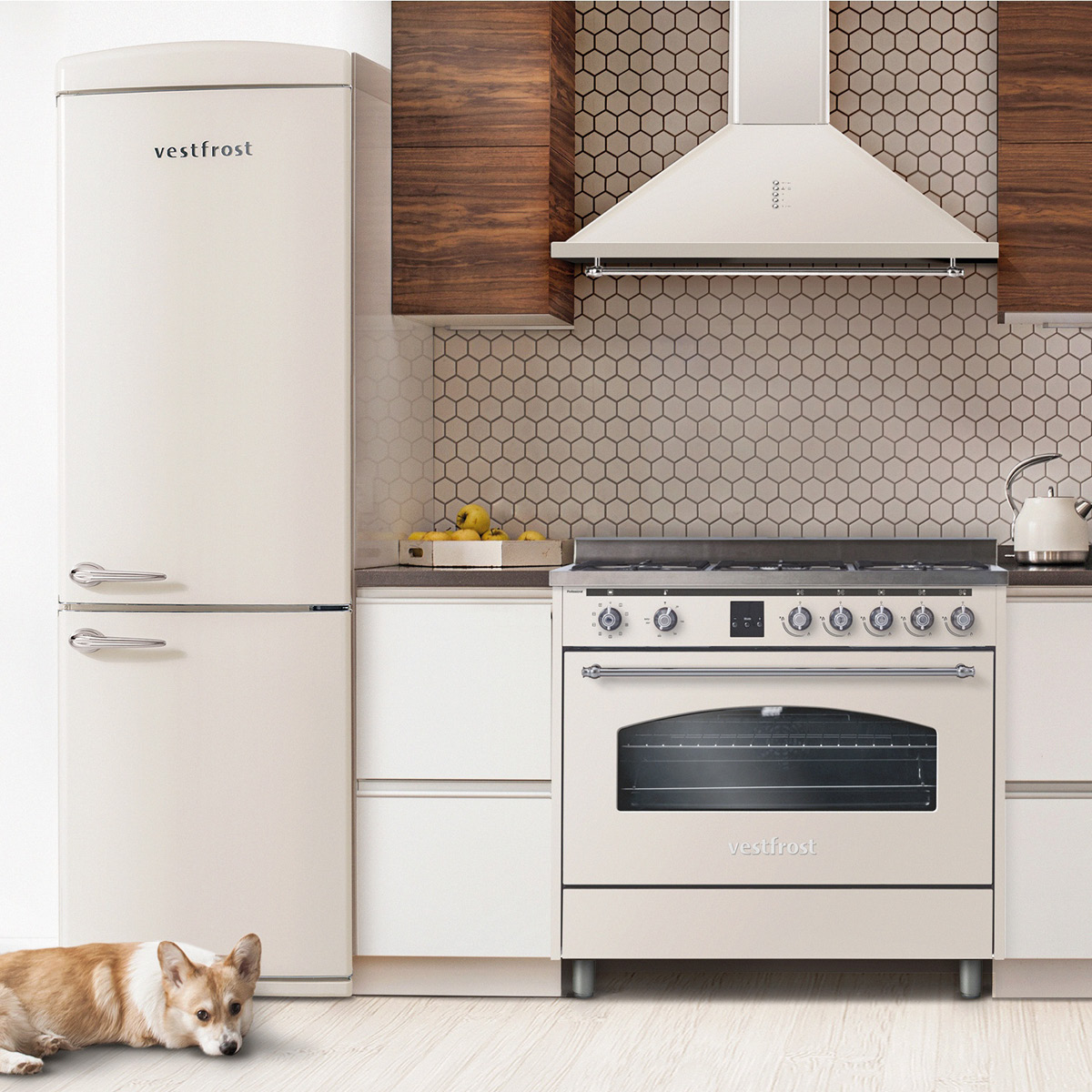 Kuchnia gazowo-elektryczna wolnostojąca w kolorze beżowym z kolekcji Retro, 9 programów pieczenia, czyszczenie katalityczne, 5 palników gazowych, zabezpieczenie przeciwpyłowe gazu.