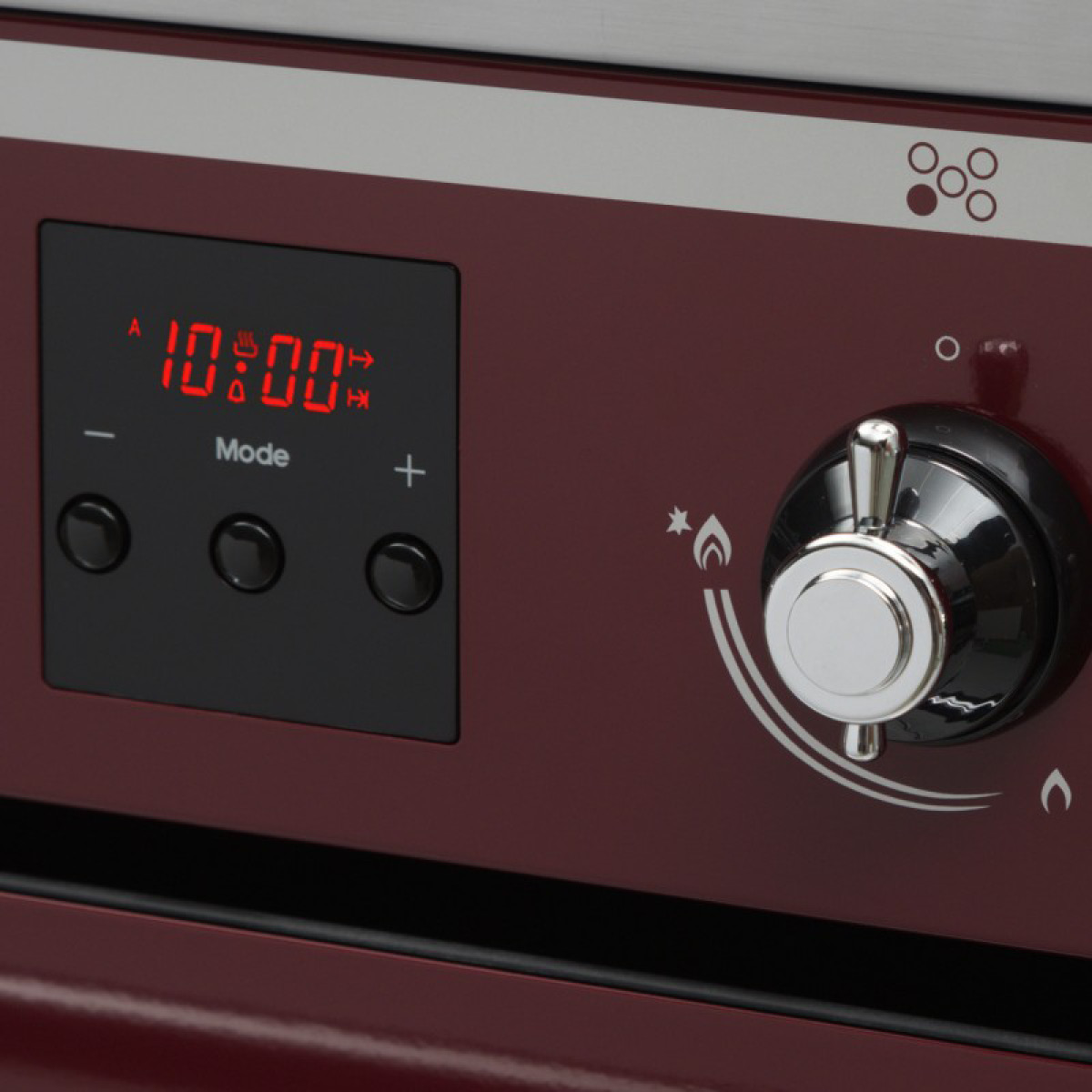 Kuchnia gazowo-elektryczna wolnostojąca w kolorze bordowym z kolekcji Retro, 9 programów pieczenia, czyszczenie katalityczne, 5 palników gazowych, zabezpieczenie przeciwpyłowe gazu.
