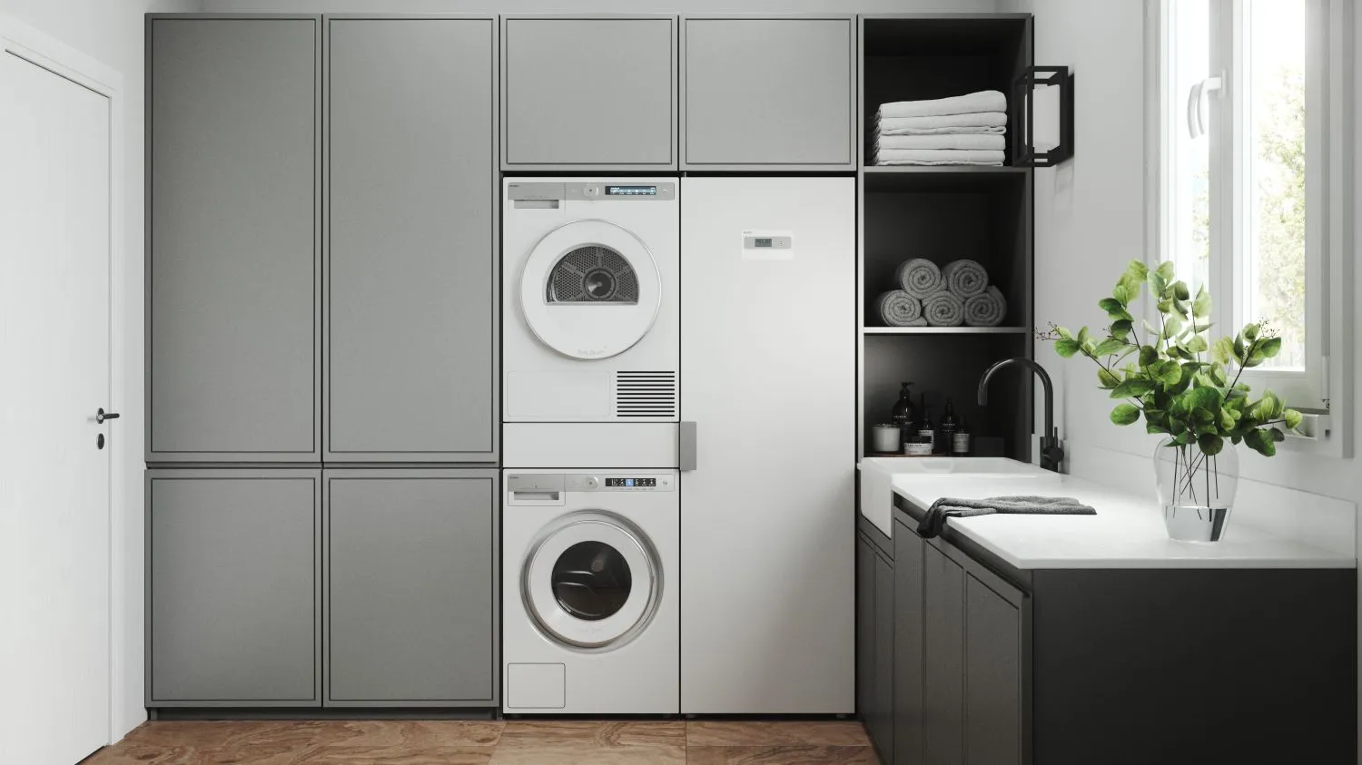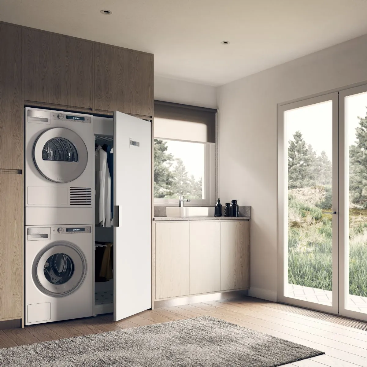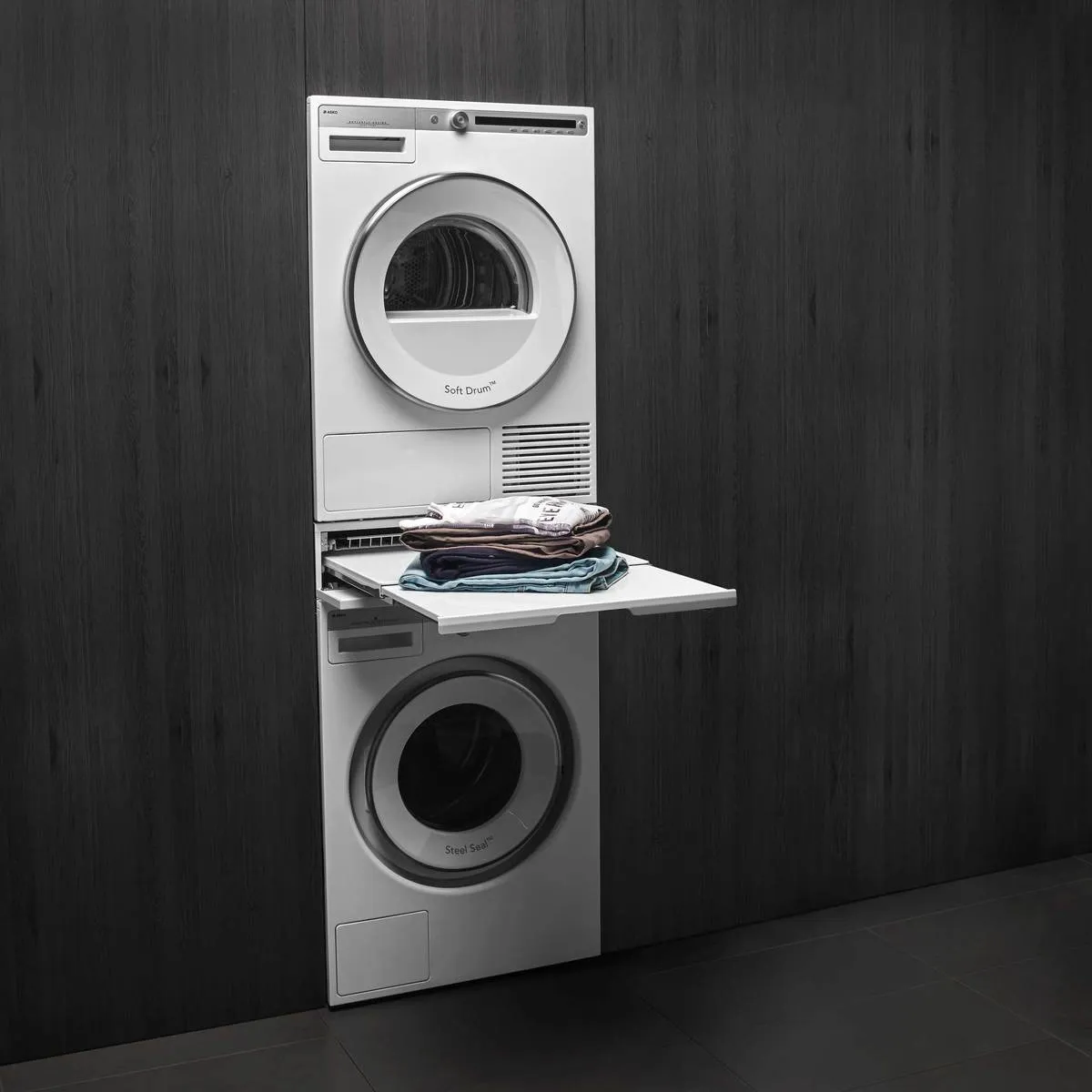 Łącznik pralki i suszarki ASKO z wysuwaną półką z koszem na pranie w kolorze białym, h=15 cm.