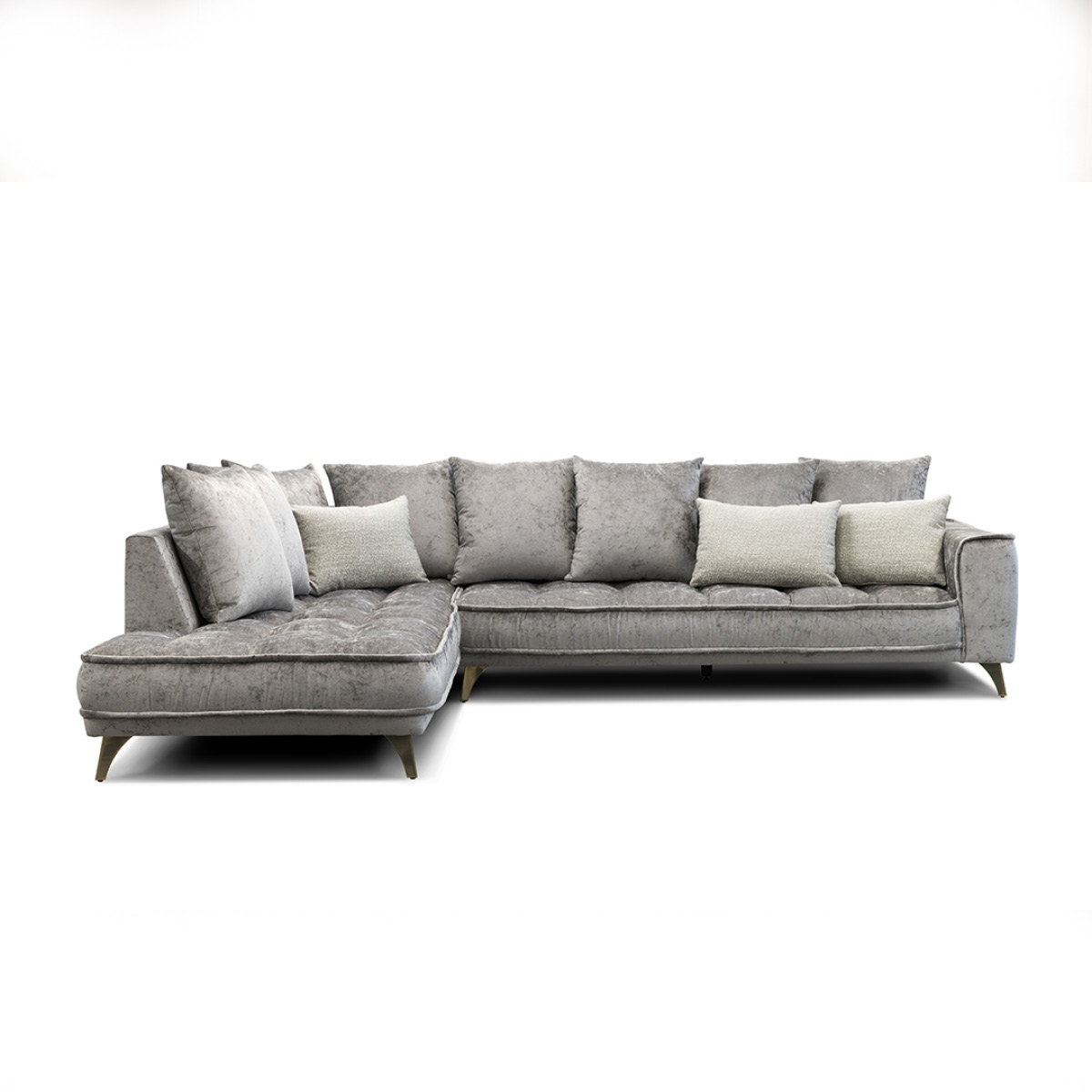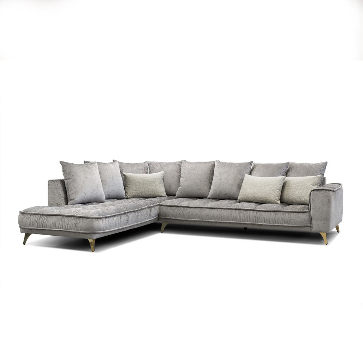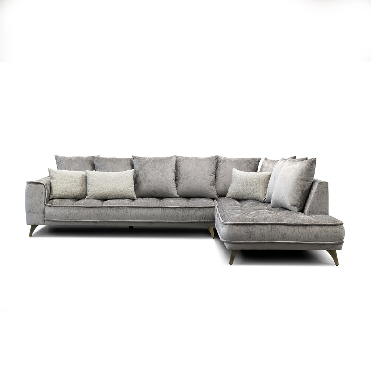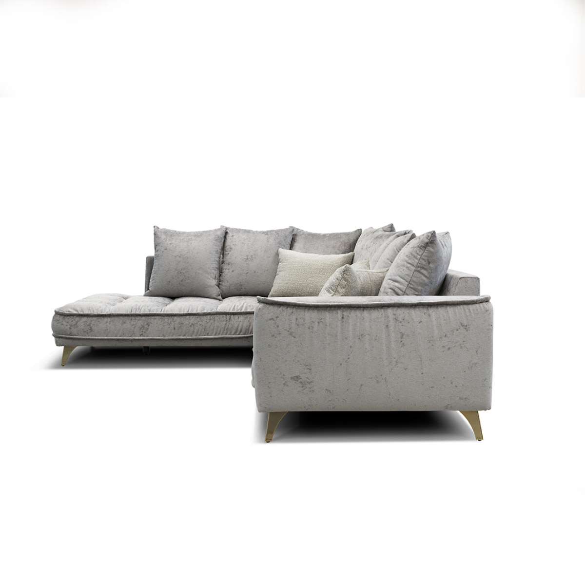 Narożnik z kolekcji Belavio firmy Befame, dostępny w wersji lewej lub prawej z bogatym wyborem tkanin wykończeniowych i różnorodną kolorystyką nóżek.