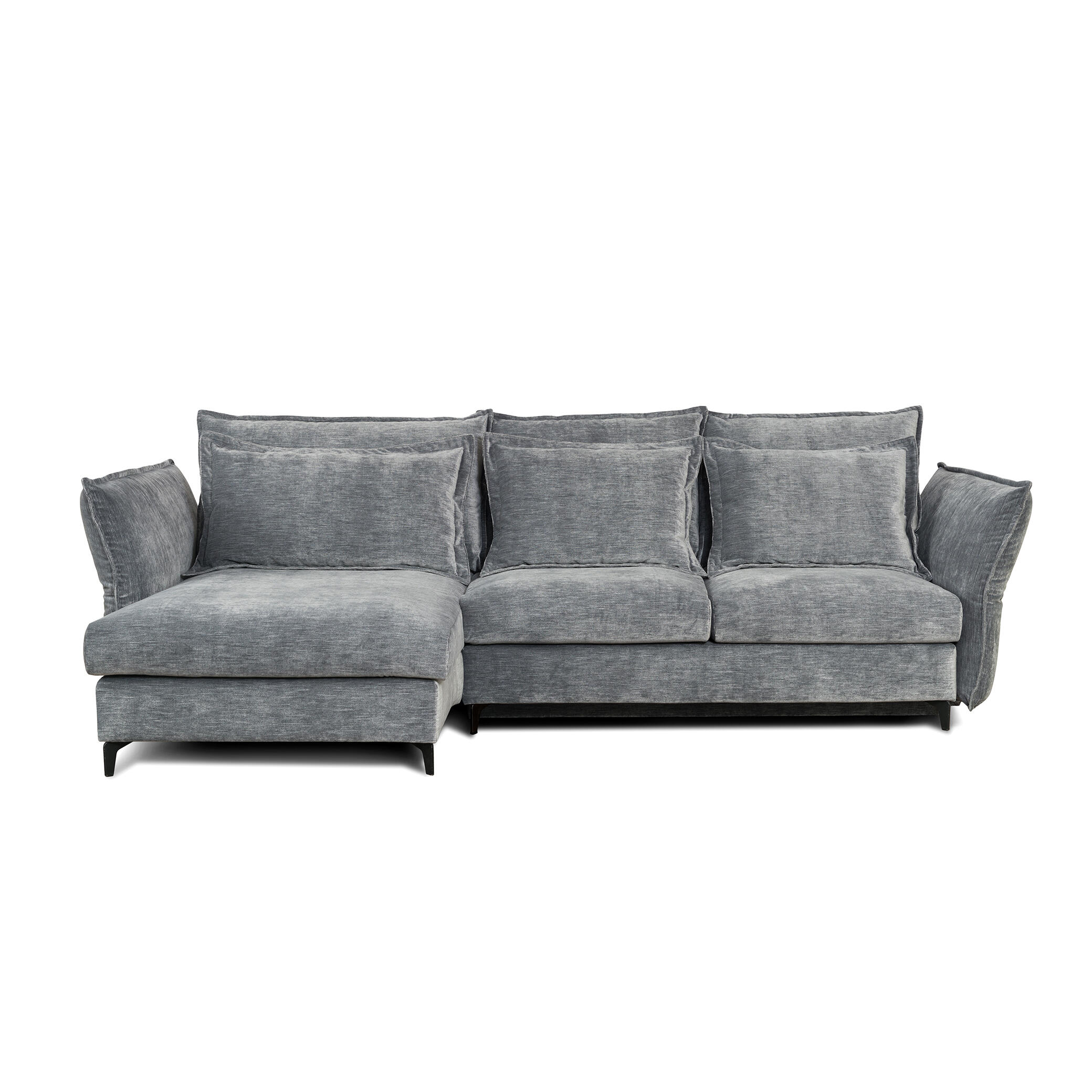 Narożnik z kolekcji Carmen firmy Befame, z funkcją spania i pojemnikiem na pościel, dostępny w wersji lewej lub prawej z bogatym wyborem tkanin wykończeniowych i różnorodną kolorystyką nóżek.
