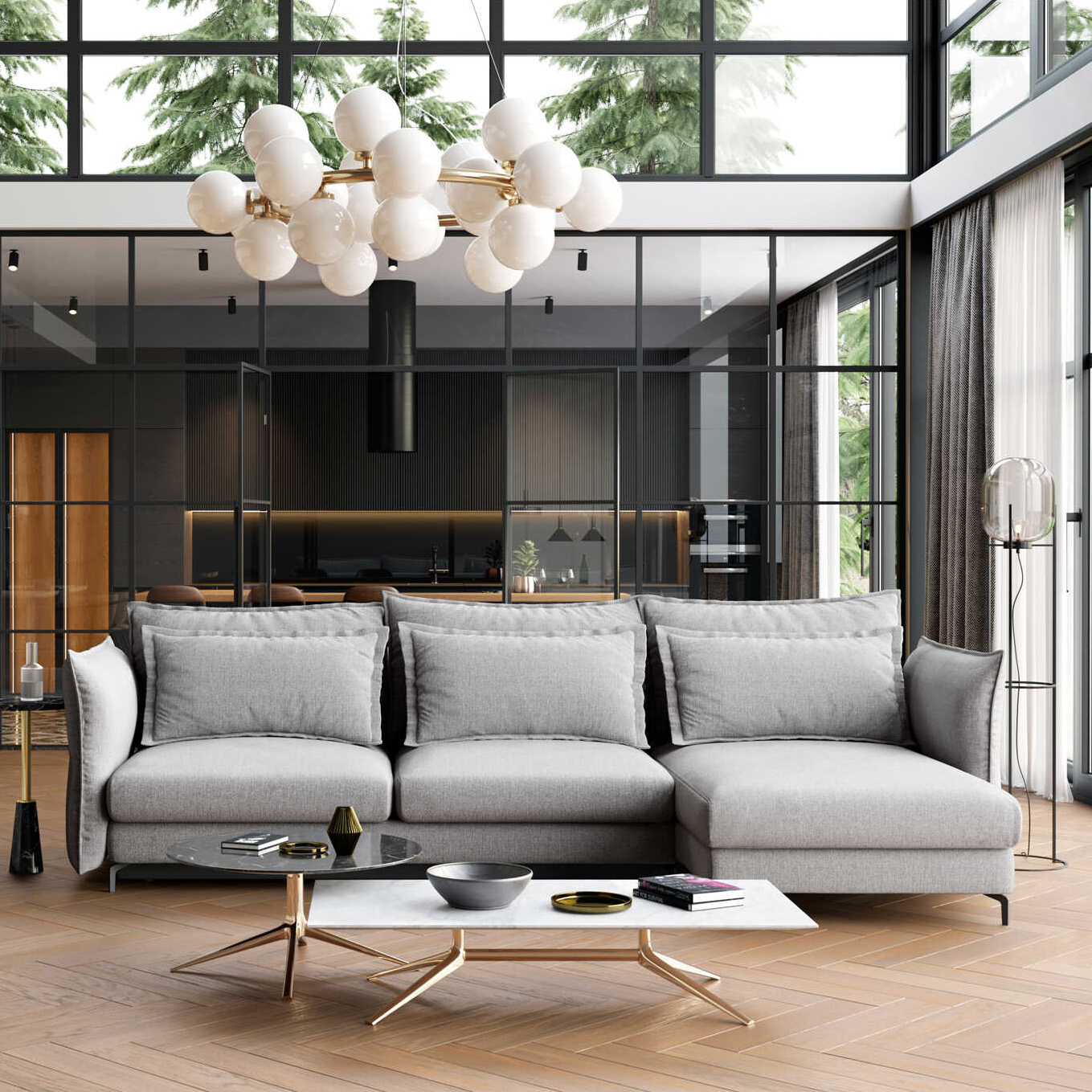 Mebel jest w całości tapicerowany (w tym tył), dzięki czemu można go usytuować na środku salonu.