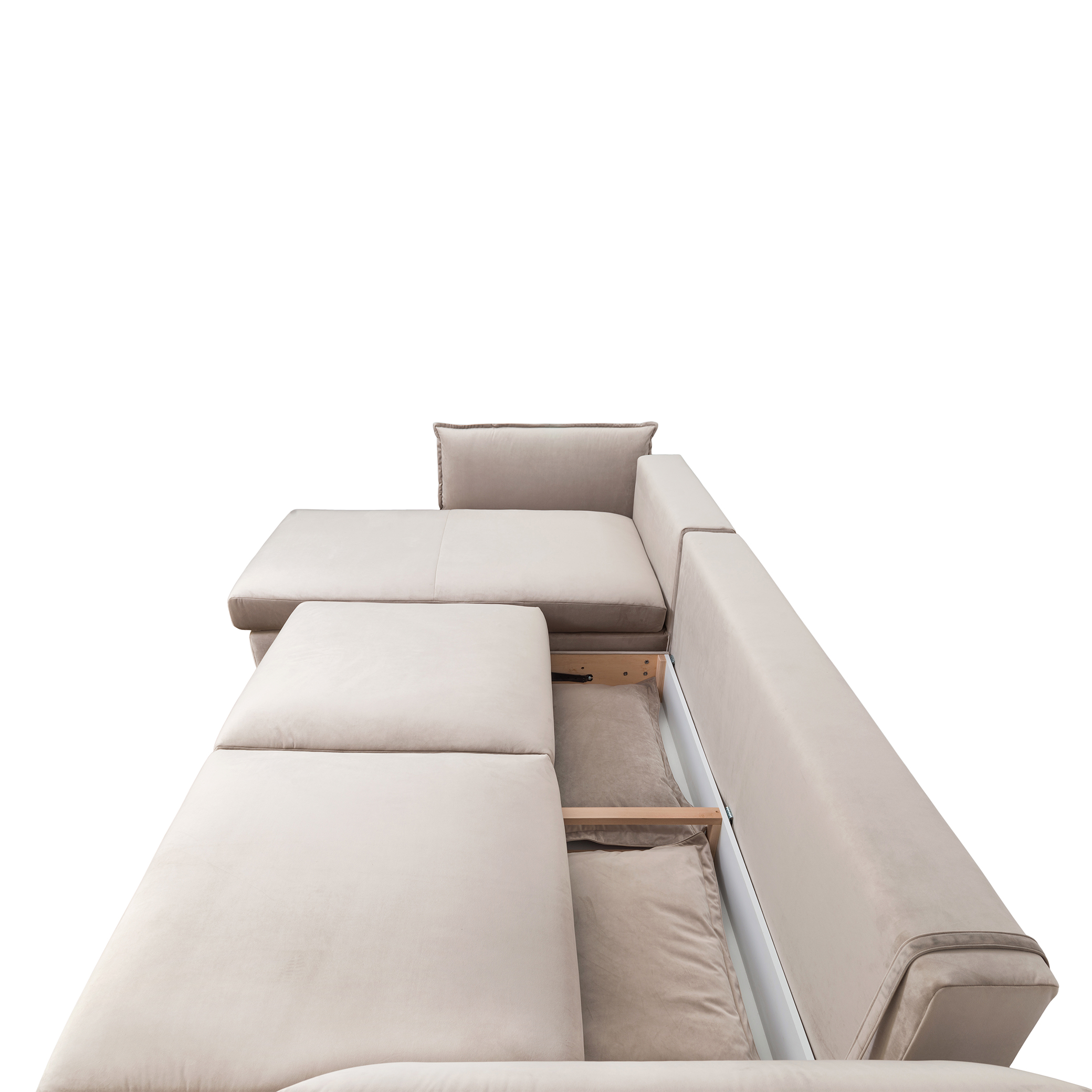 Narożnik z kolekcji Carmen firmy Befame, z funkcją spania i pojemnikiem na pościel, dostępny w wersji lewej lub prawej z bogatym wyborem tkanin wykończeniowych i różnorodną kolorystyką nóżek.