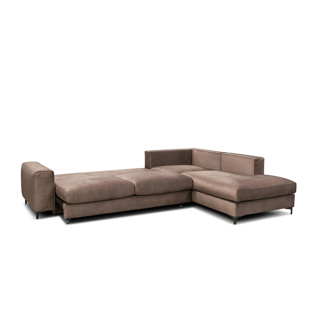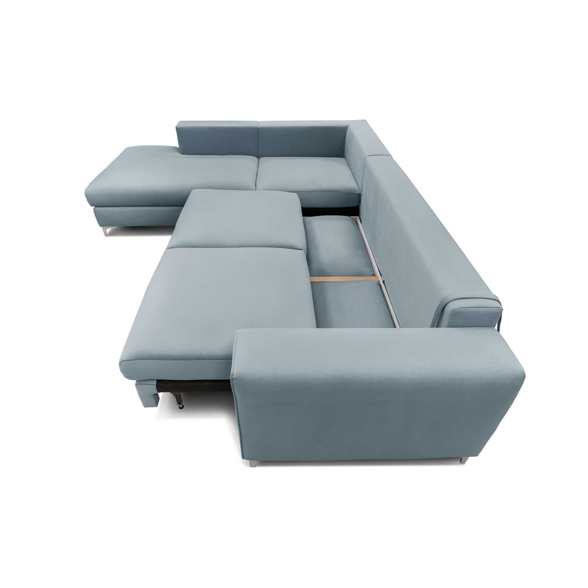 Narożnik z kolekcji Moon firmy Befame, rozkładany z funkcją spania i pojemnikiem na pościel (wersja lewa lub prawa).