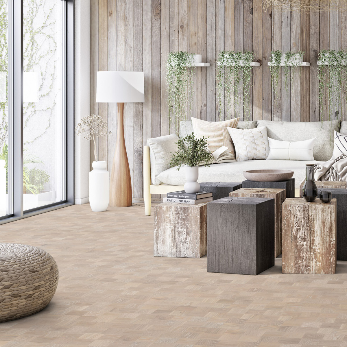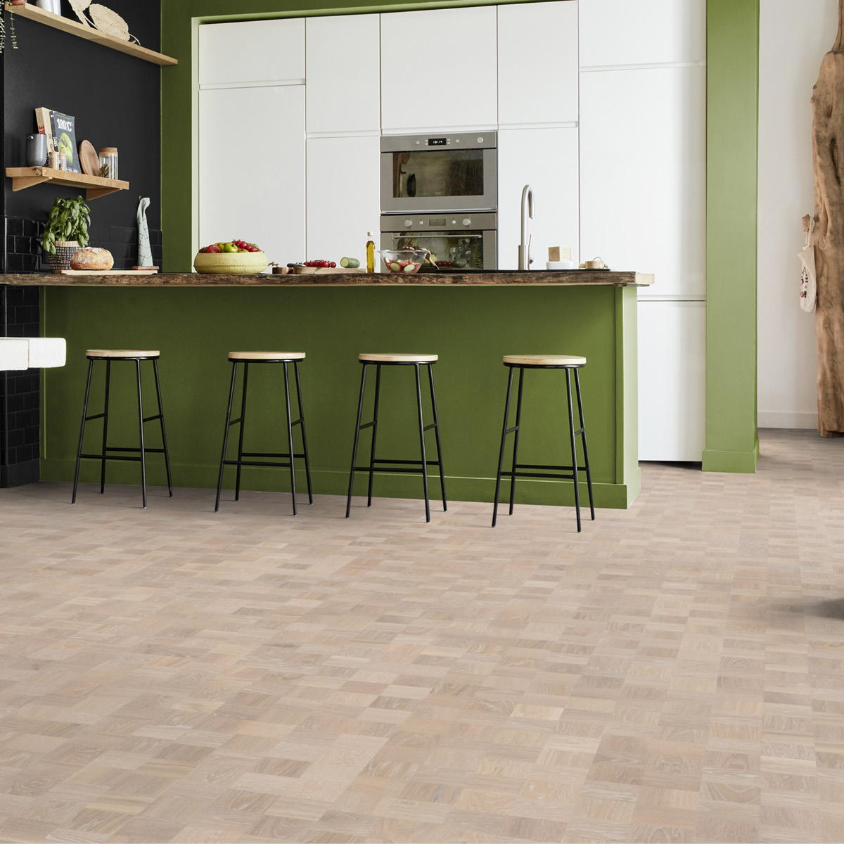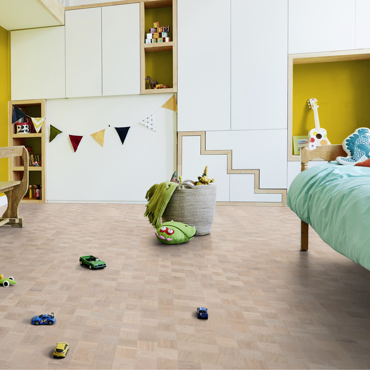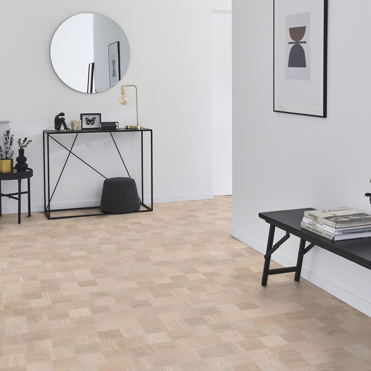Panel drewniany firmy Tarkett z kolekcji NOBLE, małe kwadraty, o grubości całkowitej 16 mm z zabezpieczeniem Proteco Hardwax Oil, 19 x 228 cm.