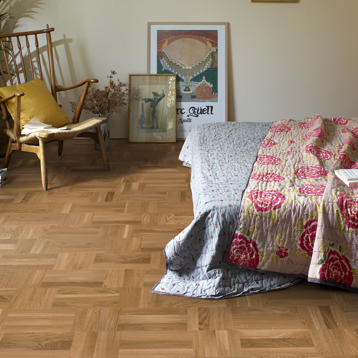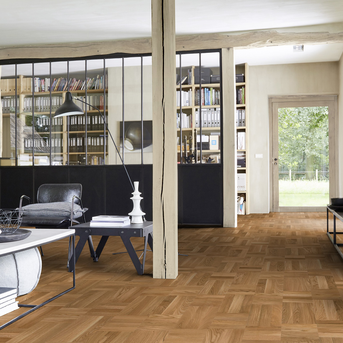 Noble to piękna reinterpretacja klasycznej techniki modułowej z lat 50-tych. Dzięki szczotkowaniu i wykończeniu olejem lub lakierem tworzy wygląd, który zmienia się w zależności od pozycji i perspektywy, gdy światło wpada do pokoju. Naprzemienne kierunki słojów, niewielkie odchylenia i niewspółosiowość nadają każdej desce blask wyjątkowości i ekskluzywności typowej dla wszystkich prac ręcznych – „doskonała niedoskonałość”.