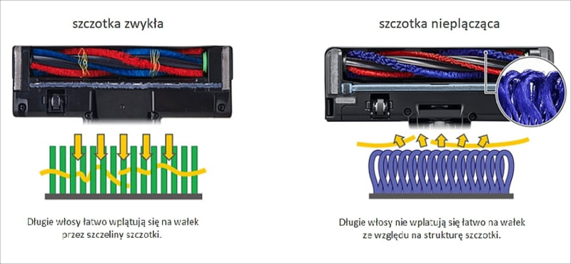 Dzięki oryginalnemu, automatycznemu napędowi opracowanemu przez firmę Hitachi ze szczotką przeciwdziałającą plątaniu się włosów, można odkurzać skuteczniej, a czyszczenie szczotki jest łatwiejsze niż kiedykolwiek wcześniej.