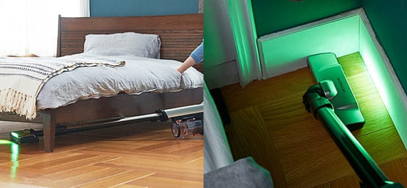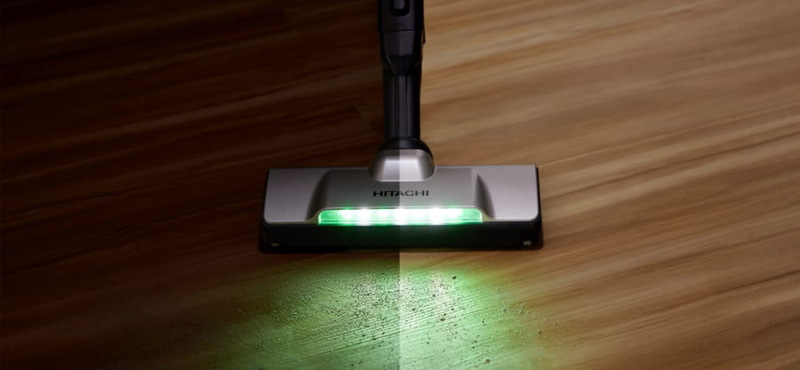 Białe i zielone diody LED oświetlają odkurzane miejsce i pozwalają zobaczyć nawet drobne zanieczyszczenia. Zielone światło jest zbliżone do długości fali, przy której wydaje się najjaśniejsze i tworzy kontrast jasności między kurzem a podłogą, aby jeszcze łatwiej dostrzec kurz. Dodatkowo, nowo zaprojektowana obudowa lamp skutecznie zbiera światło 7 LED i oświetla podłogę przed odkurzaniem. Dzięki temu trudno dostrzegalny pył wyróżnia się nie tylko w ciemnych, ale także na jasno oświetlonej podłodze.