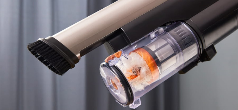 Zapomnij o problemach z opróżnianiem pojemnika na kurz! Przepływ powietrza pozwala na ściśnięcie zebranego kurzu na dnie pojemnika. Włosy i kurz są mniej podatne na zaplątanie się w cylindrze wewnętrznym, który znajduje się w środku pojemnika. Dzięki tej właściwości łatwiej jest opróżnić pojemnik na kurz – wystarczy tylko jedno naciśnięcie przycisku.
