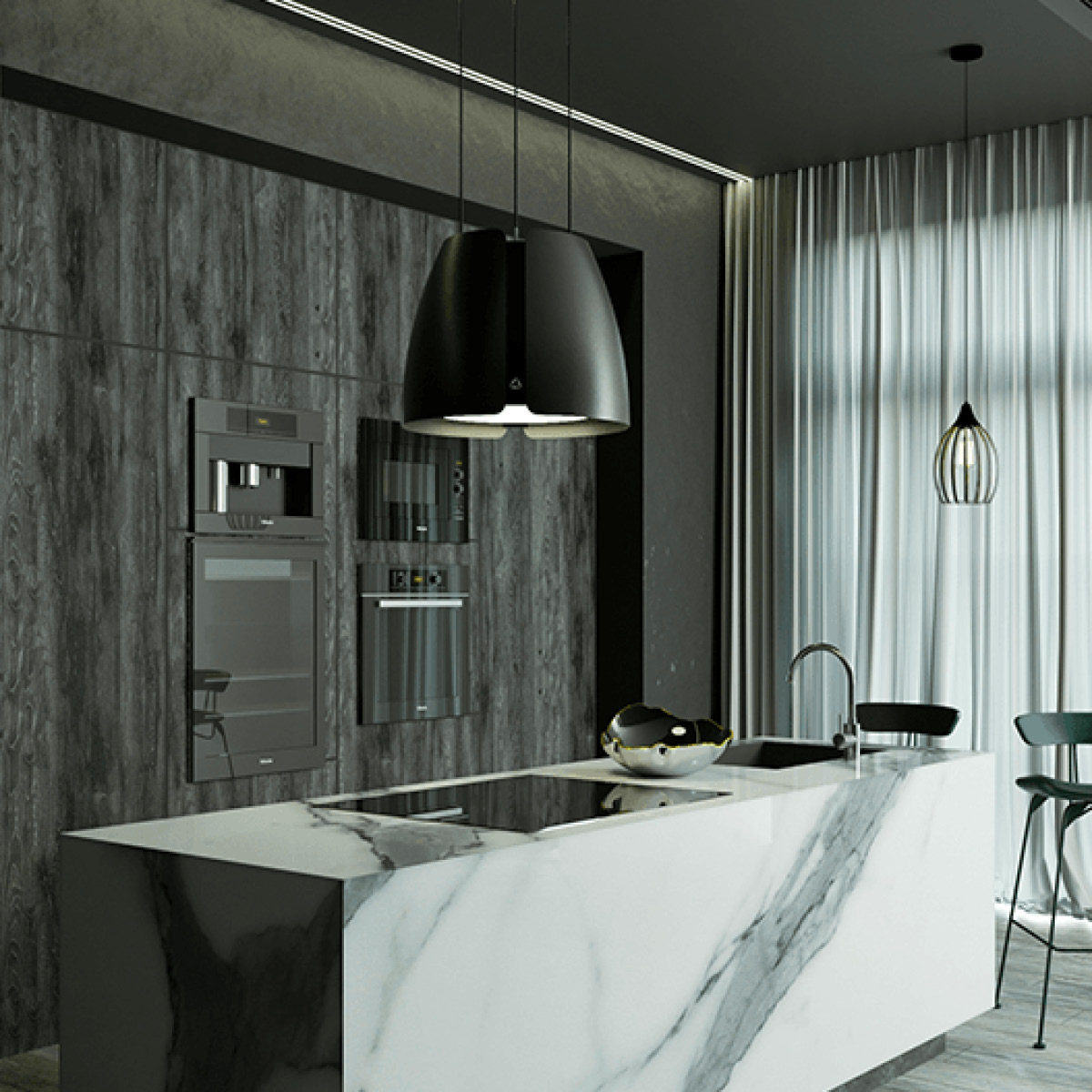 Miss W w kształcie dekoracyjnej czarnej lub białej lampy sprawdzi się w nowoczesnej kuchni i ozdobi przestrzeń między kuchnią a salonem. Montowany jest do sufitu nad płytą grzewczą za pomocą wytrzymałych stalowych linek, by nadać urządzeniu jeszcze więcej elegancji i lekkości.