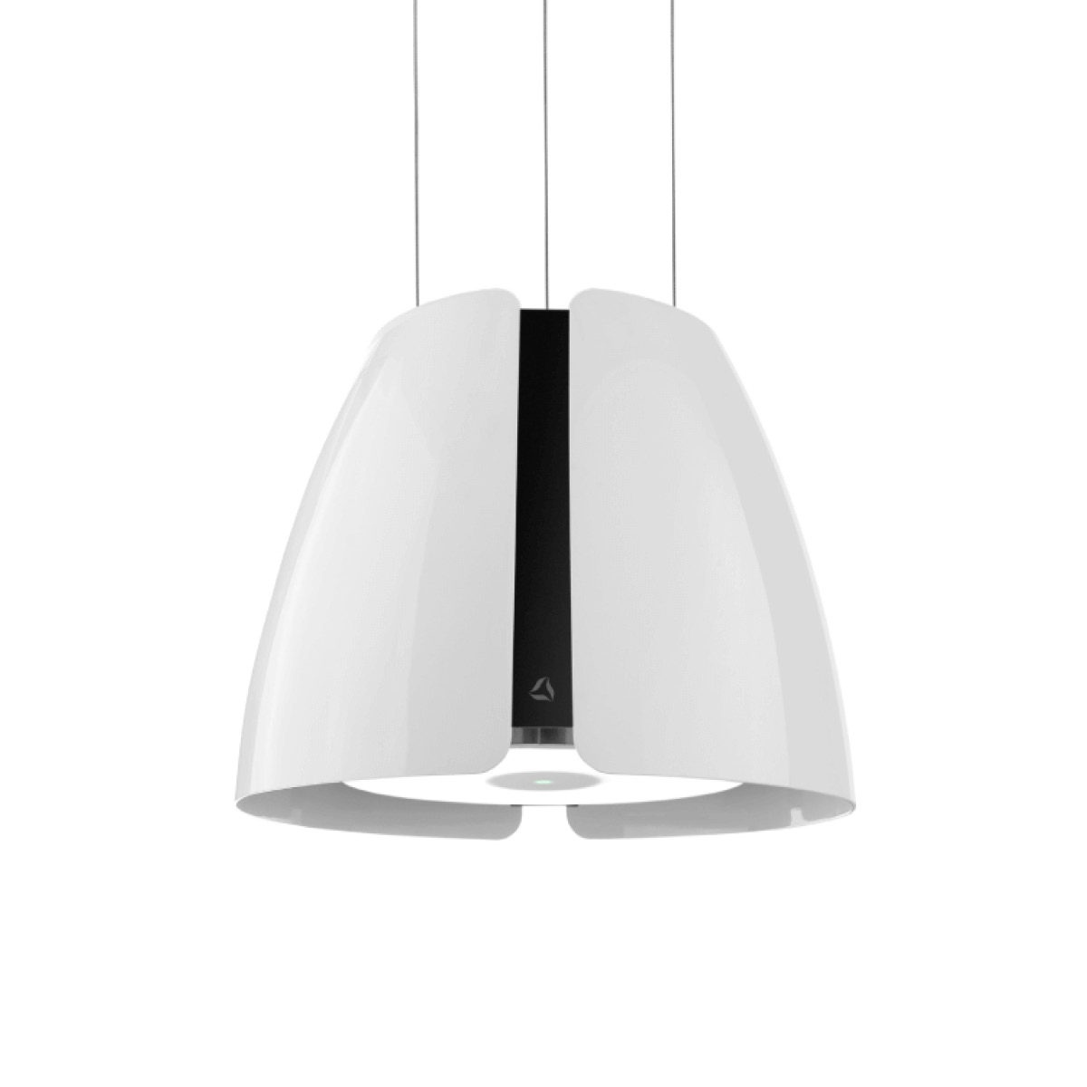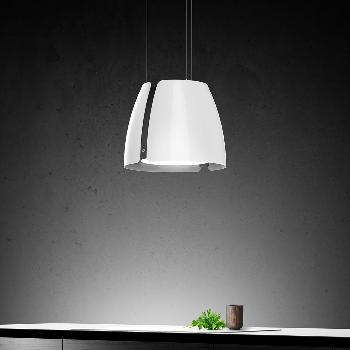 Okap wyspowy MISS W w kolorze białym, oświetlenie: LED plafon, Warm2Cold, GestureControl, tryb pracy pochłaniacz, 41~60 (68) dB, 105~295 (475) m³/h, A, ø 50 cm.