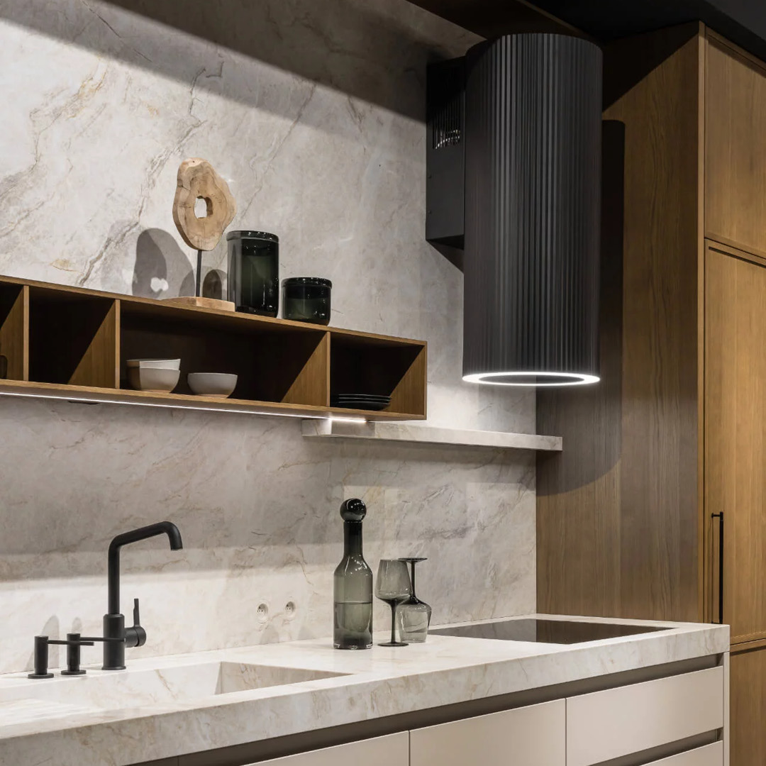 Geometryczna forma okapu doskonale wpisuje się w nowoczesną wizję wnętrza. Elegancka obudowa posiada aż 84 harmonijne zgięcia, które cieszą oko każdego miłośnika designu. To okap, który wygląda w kuchni jak minimalistyczna rzeźba!