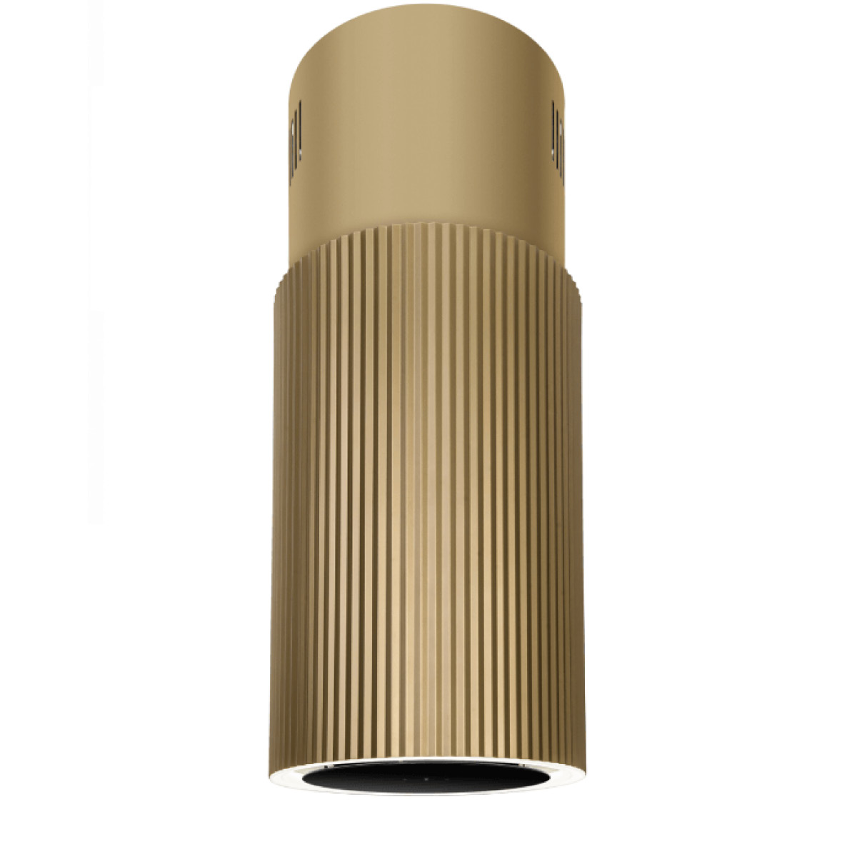 Okap wyspowy MONOGRAM W w kolorze złotym, oświetlenie: LED po obwodzie, Warm2Cold, GestureControl, możliwość połączenia z płytą indukcyjną, tryb pracy wyciąg, 39~56 (69) dB, 160~370 (670) m³/h, A+, ø38 cm.