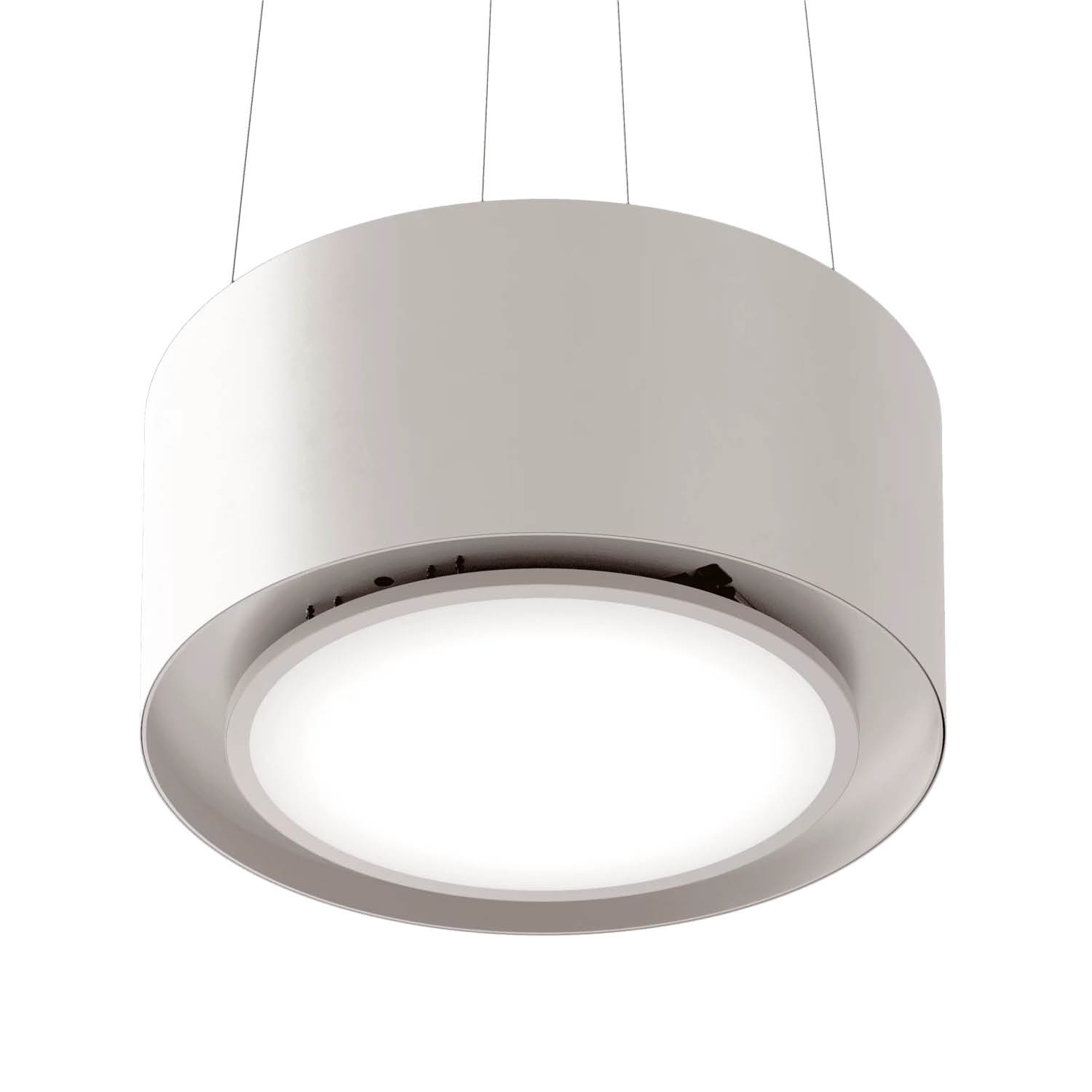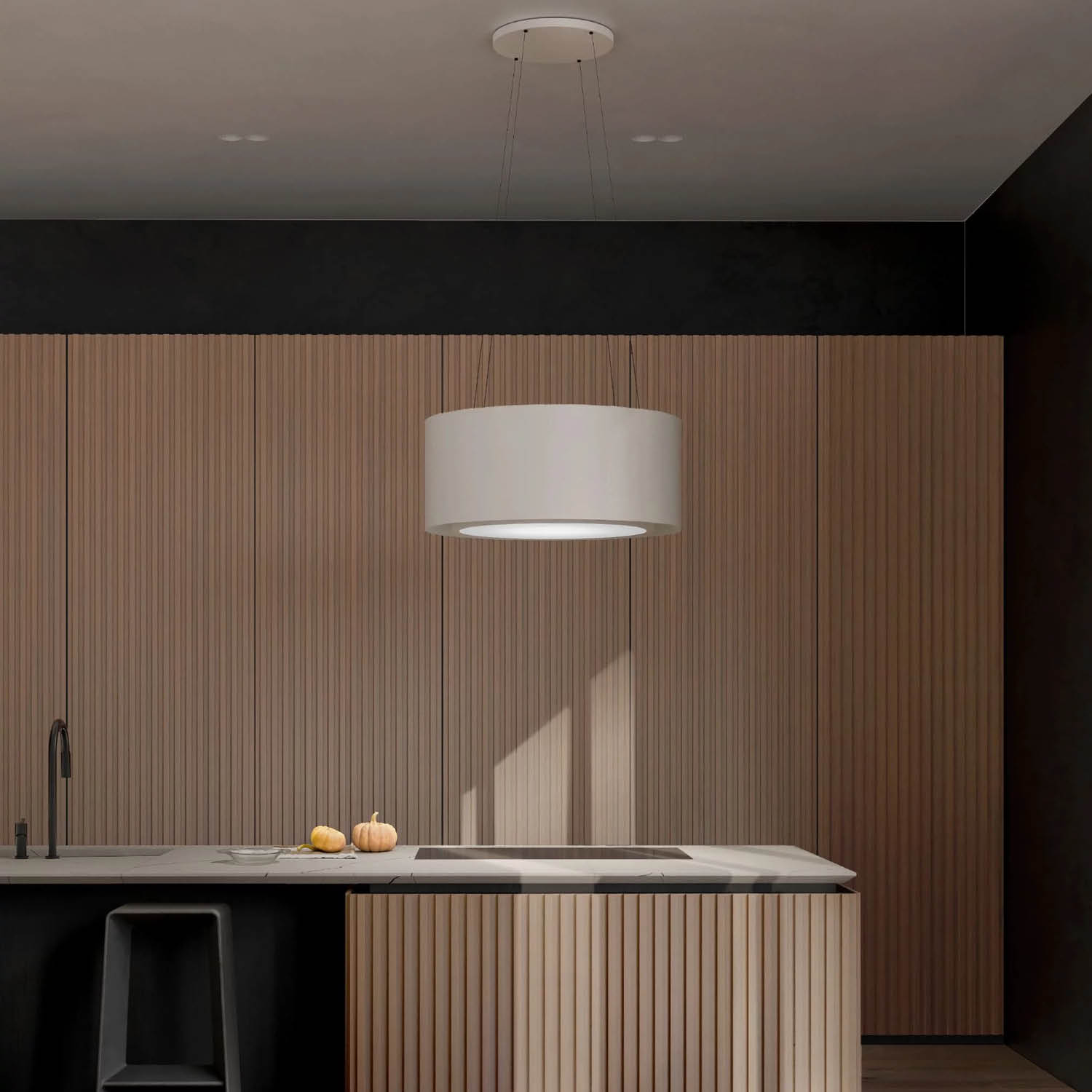 Okap wyspowy PIU LIGHT w kolorze ecru, oświetlenie panelowe, Warm2Cold, GestureControl, możliwość połączenia z płytą indukcyjną, tryb pracy pochłaniacz, 41~56 (67) dB, 180~360 (640) m³/h, A+, ø80 cm.