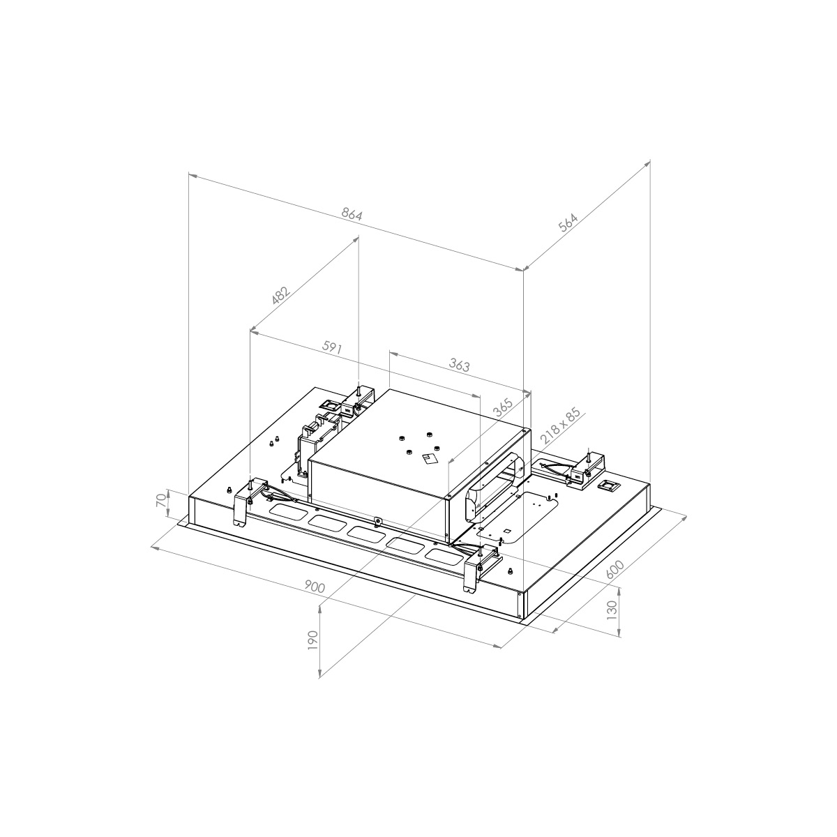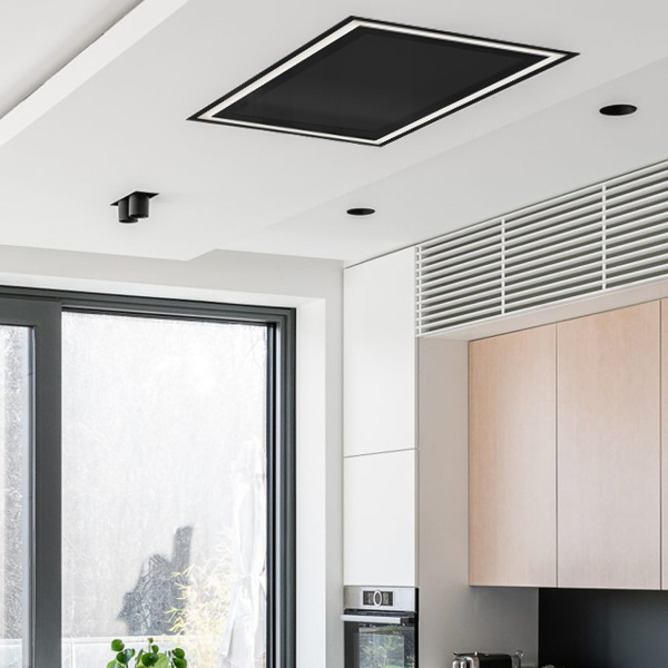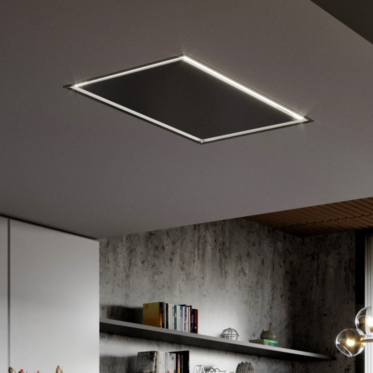 Okap sufitowy SU FRAME w kolorze czarnym, oświetlenie: LED po obwodzie, Warm2Cold, tryb pracy wyciąg, 44~64 (70) dB, 190~475 (750) m³/h, A, 90 x 60 cm.