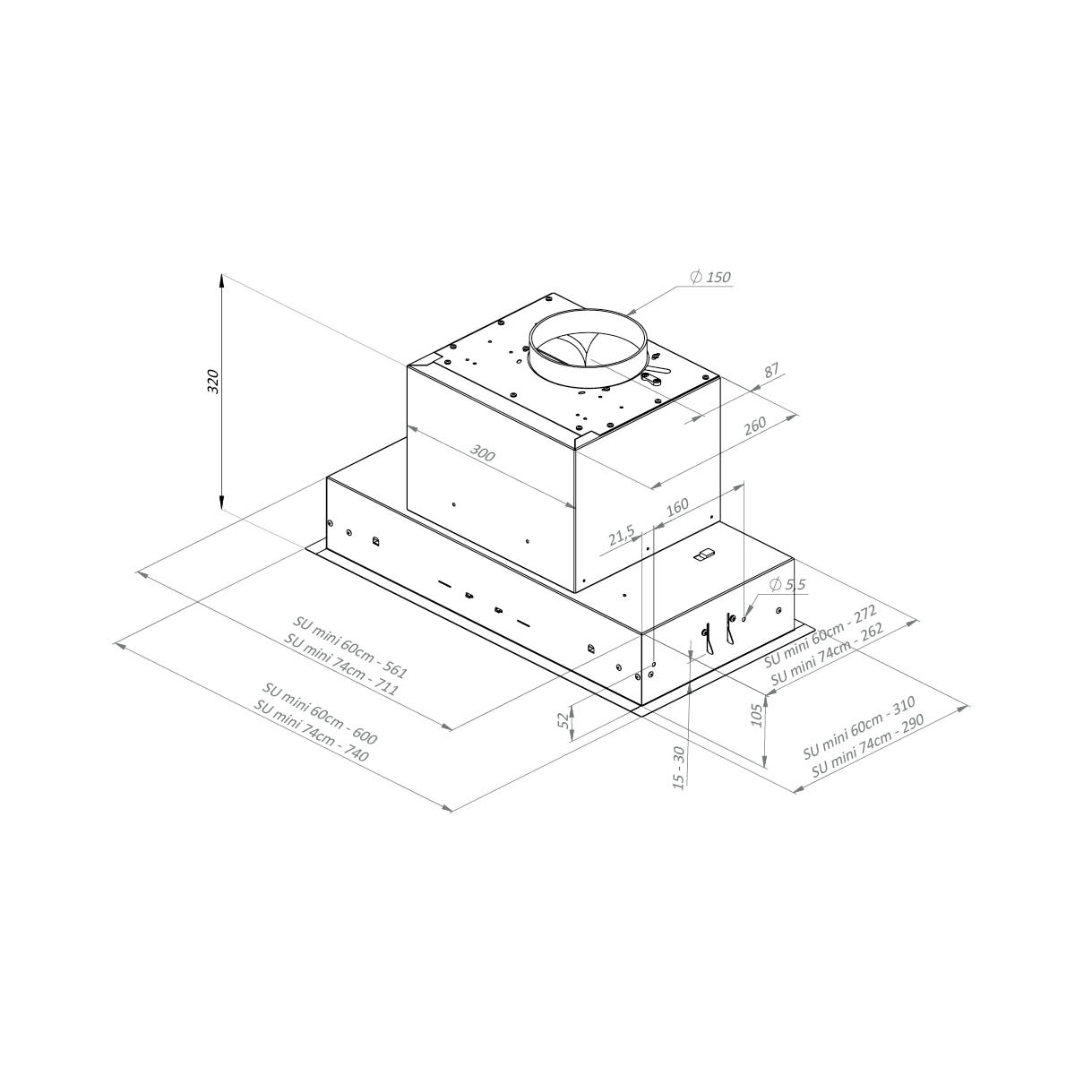 Okap podszafkowy SU MINI w kolorze białym, oświetlenie: LED plafon, Warm2Cold, GestureControl, możliwość połączenia z płytą indukcyjną, tryb pracy pochłaniacz, 42~58 (69) dB, 185~380 (680) m³/h, A++, 60 cm.