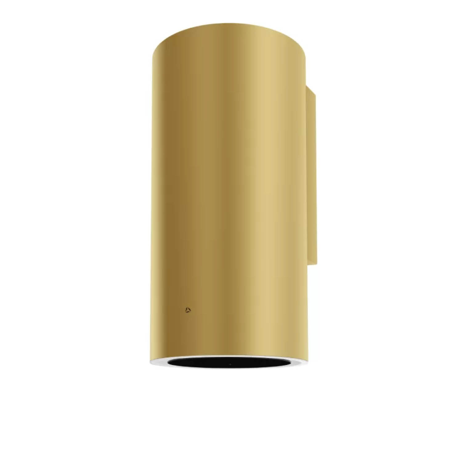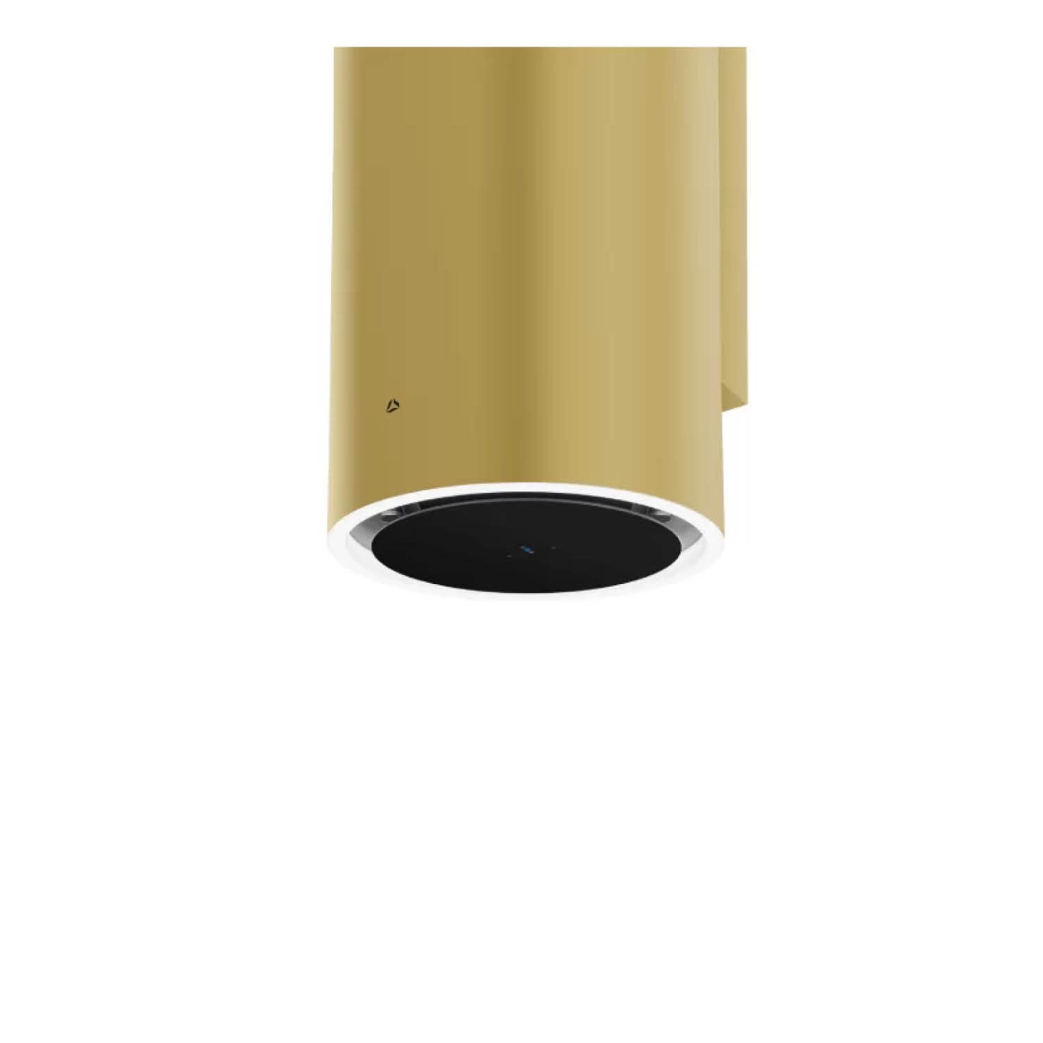 Okap przyścienny TUBUS w kolorze złotym, oświetlenie LED po obwodzie, Warm2Cold, GestureControl, możliwość połączenia z płytą indukcyjną, tryb pracy wyciąg, 39~56 (69) dB, 160~370 (670) m³/h, A+, 38 cm.