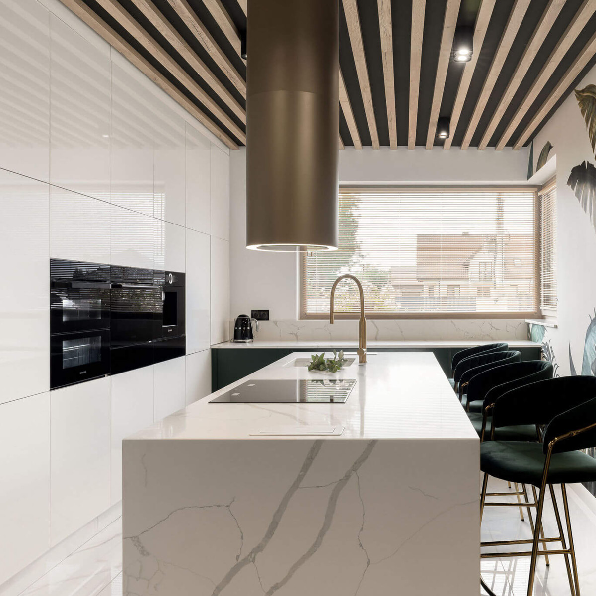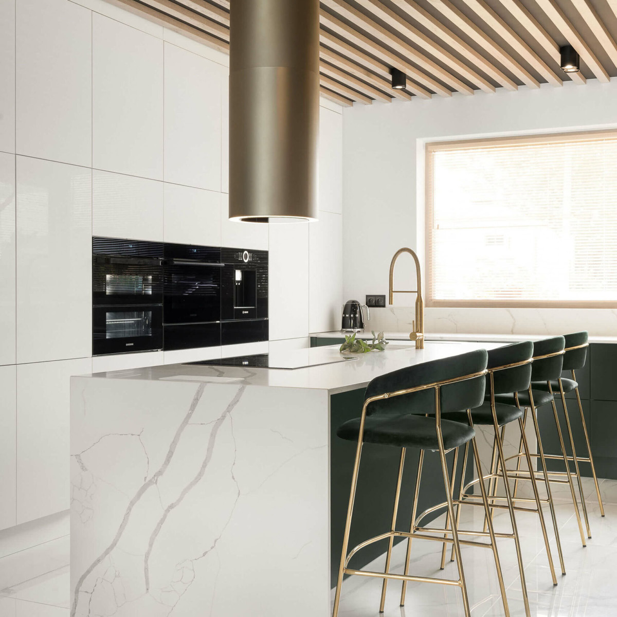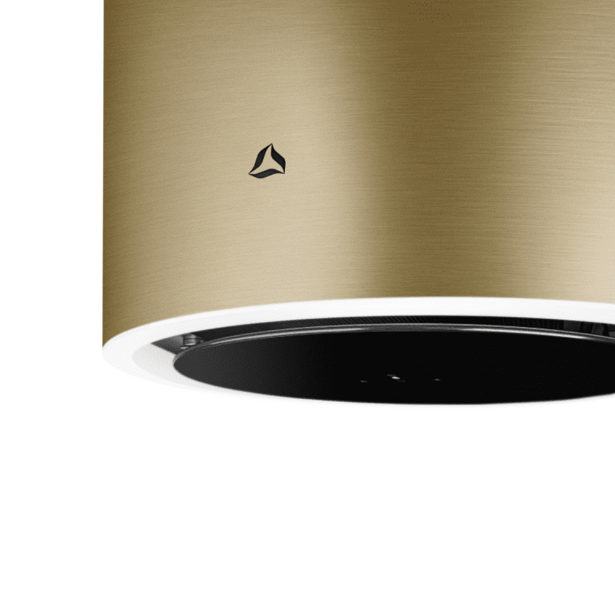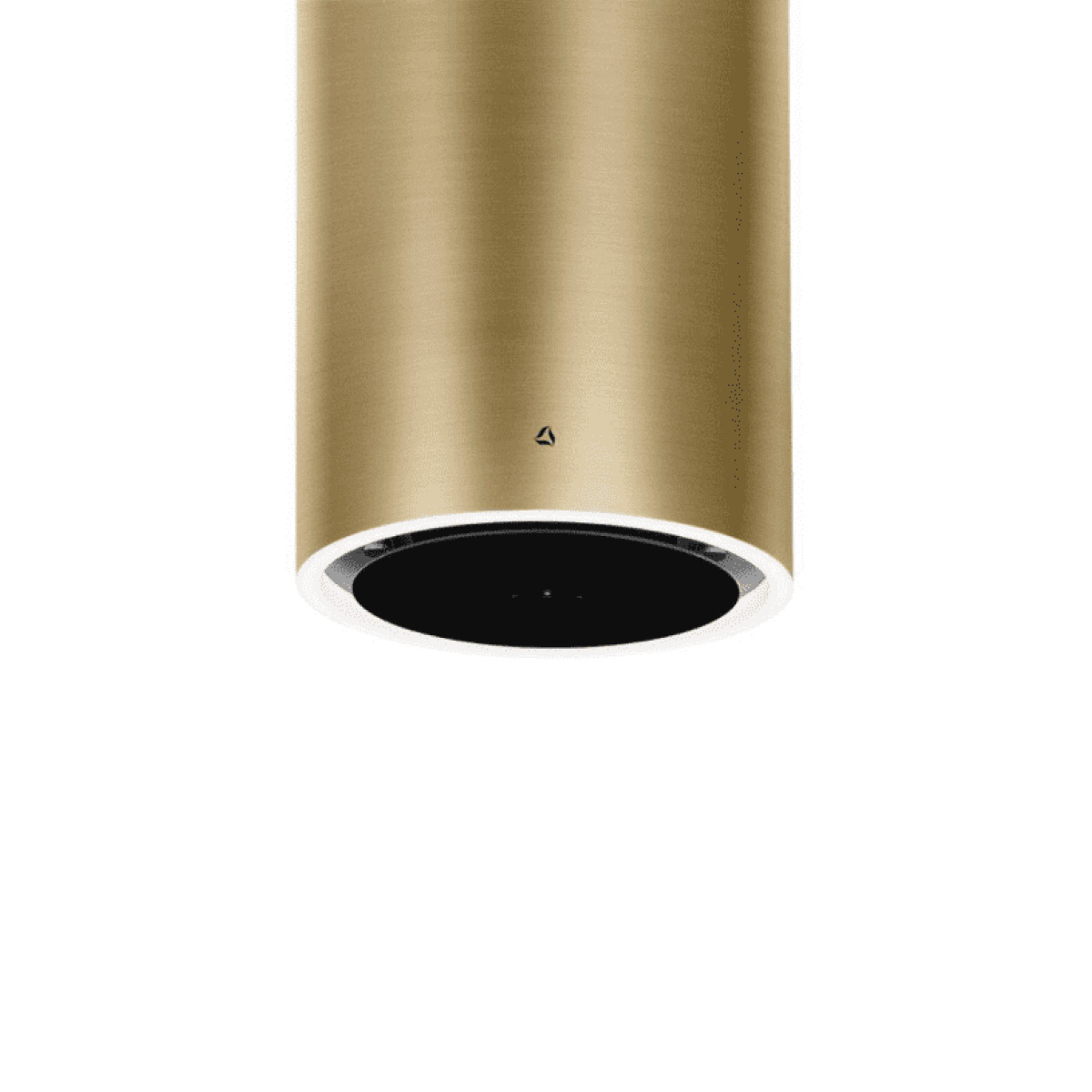 Okap wyspowy TUBUS W w kolorze złotej stali, oświetlenie: LED po obwodzie, Warm2Cold, GestureControl, możliwość połączenia z płytą indukcyjną, tryb pracy pochłaniacz, 39~56 (69) dB, 160~370 (670) m³/h, A+, ∅ 38 cm.