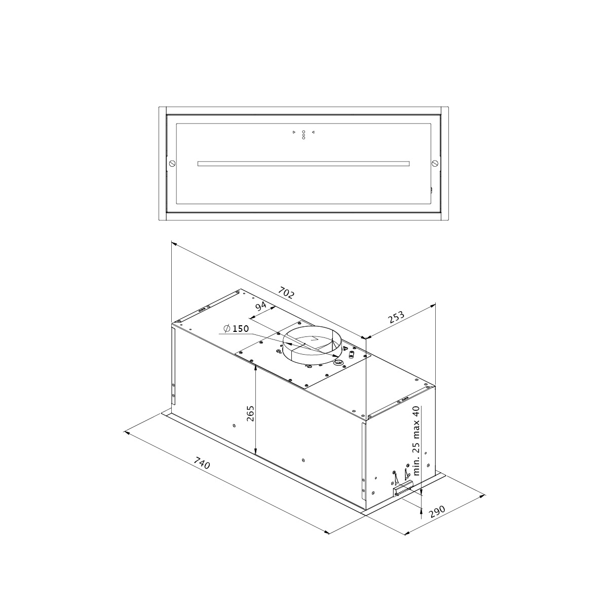 Niewielka szerokość i głębokość sprawiają, że z łatwością zmieści się w szafce. Pasuje do szafek o dowolnym rodzaju zawiasów. Może być montowany już od 50 cm nad płytą indukcyjną.