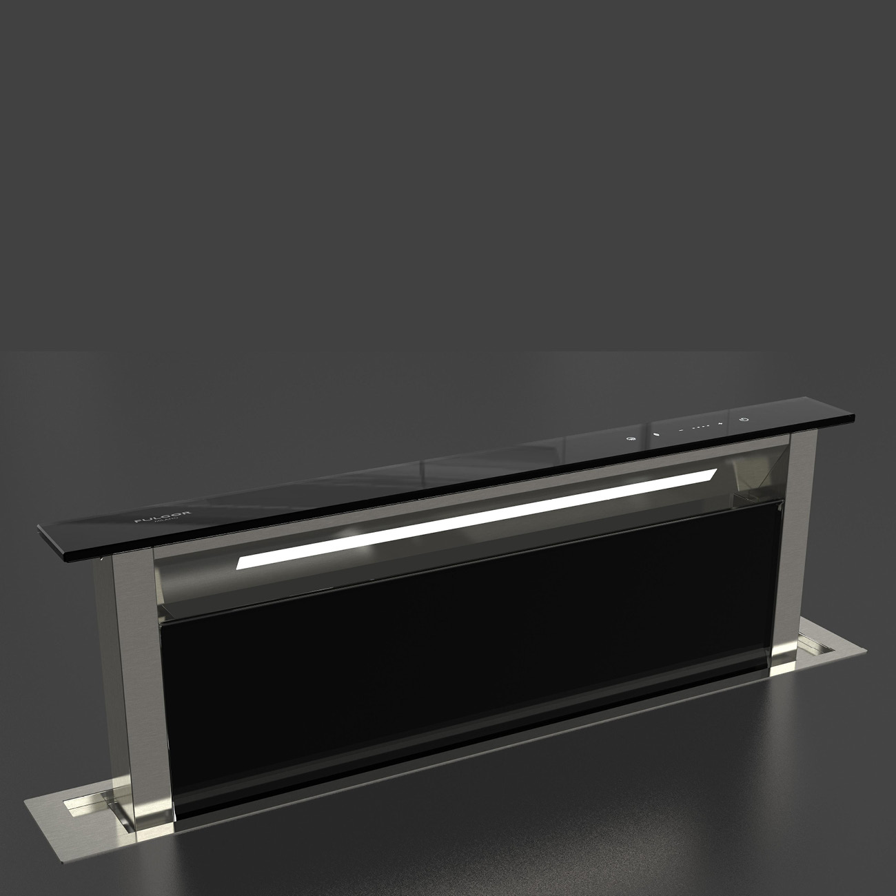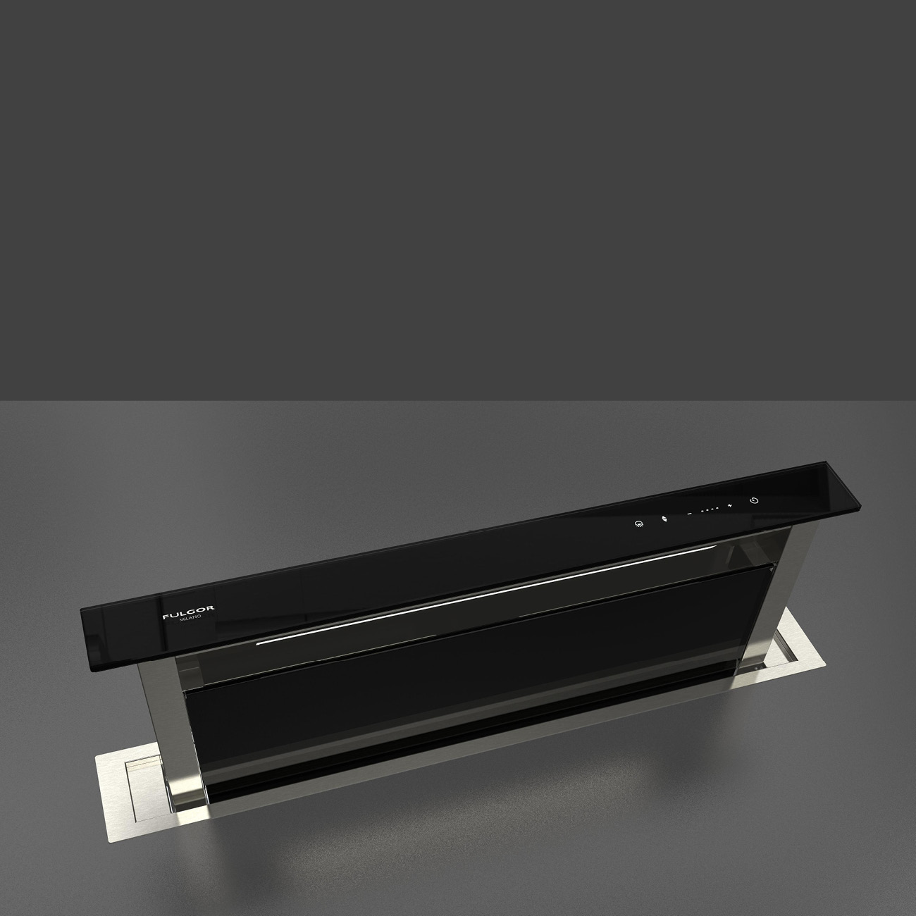 Okap typu downdraft do zabudowy Fulgor Milano FDDH 900 TRC X z serii Plano w kolorze czarne szkło, oświetlenie LED, tryb wyciąg lub pochłaniacz, dotykowy panel sterowania, do 800 m³/h, 90 cm.