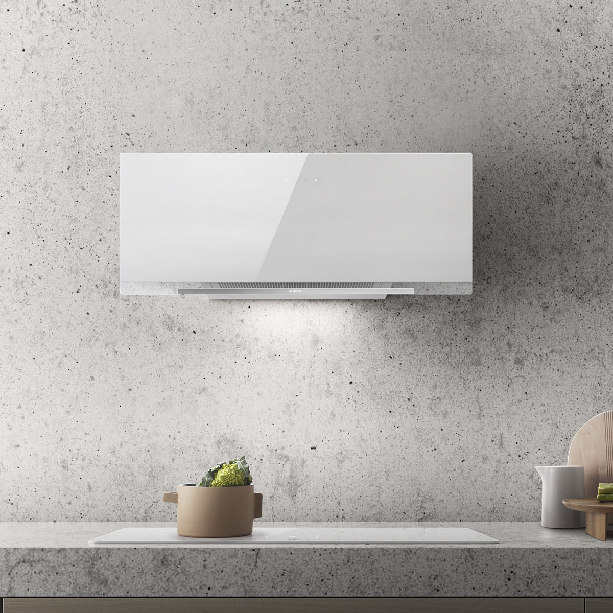 APLOMB w kolorze białym, okap przyścienny o wysokiej wydajności. Model przyciąga uwagę dzięki prostej, geometrycznej bryle, a elegancki design sprawia, że idealnie pasuje do nowoczesnych, przestronnych wnętrz, wersja wyciąg 680 m³/h, 90 cm.