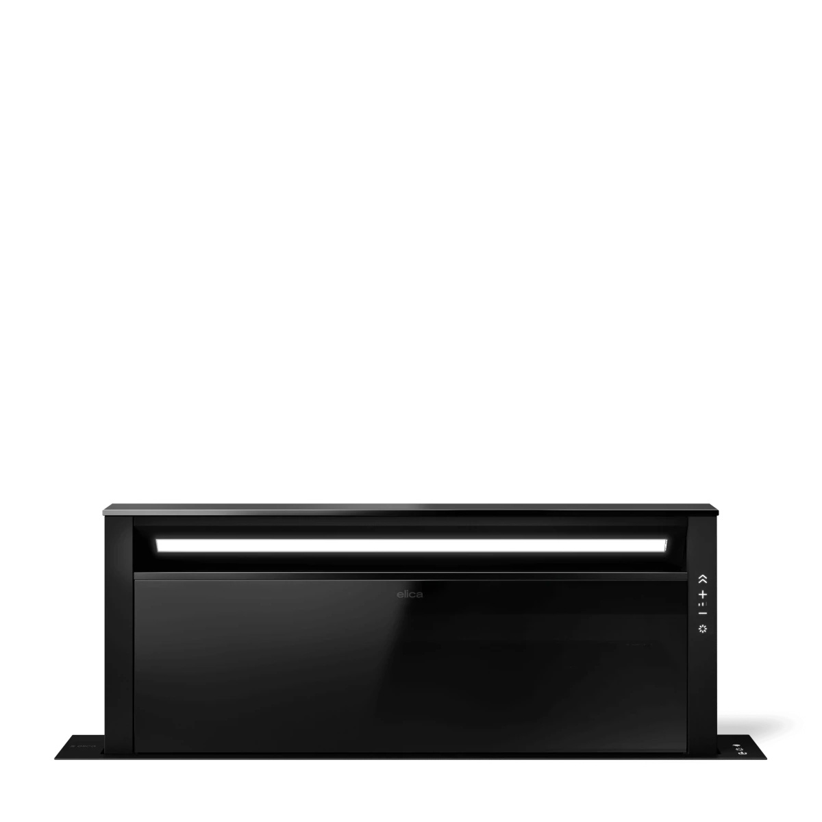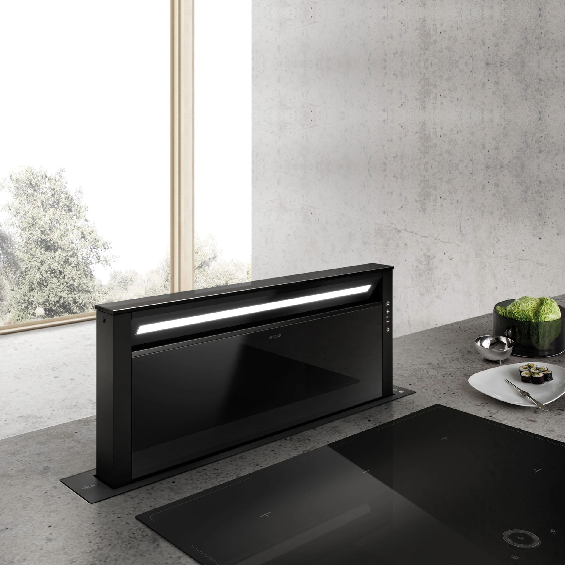 Okap typu downdraft w kolorze czarny mat + czarne szkło, który wysuwa się z blatu kuchennego. Pojawia się tylko wtedy, gdy jest potrzebny. Można nim zarządzać za pomocą aplikacji i asystenta głosowego, wersja wyciąg, 730 m³/h, 86 cm.
