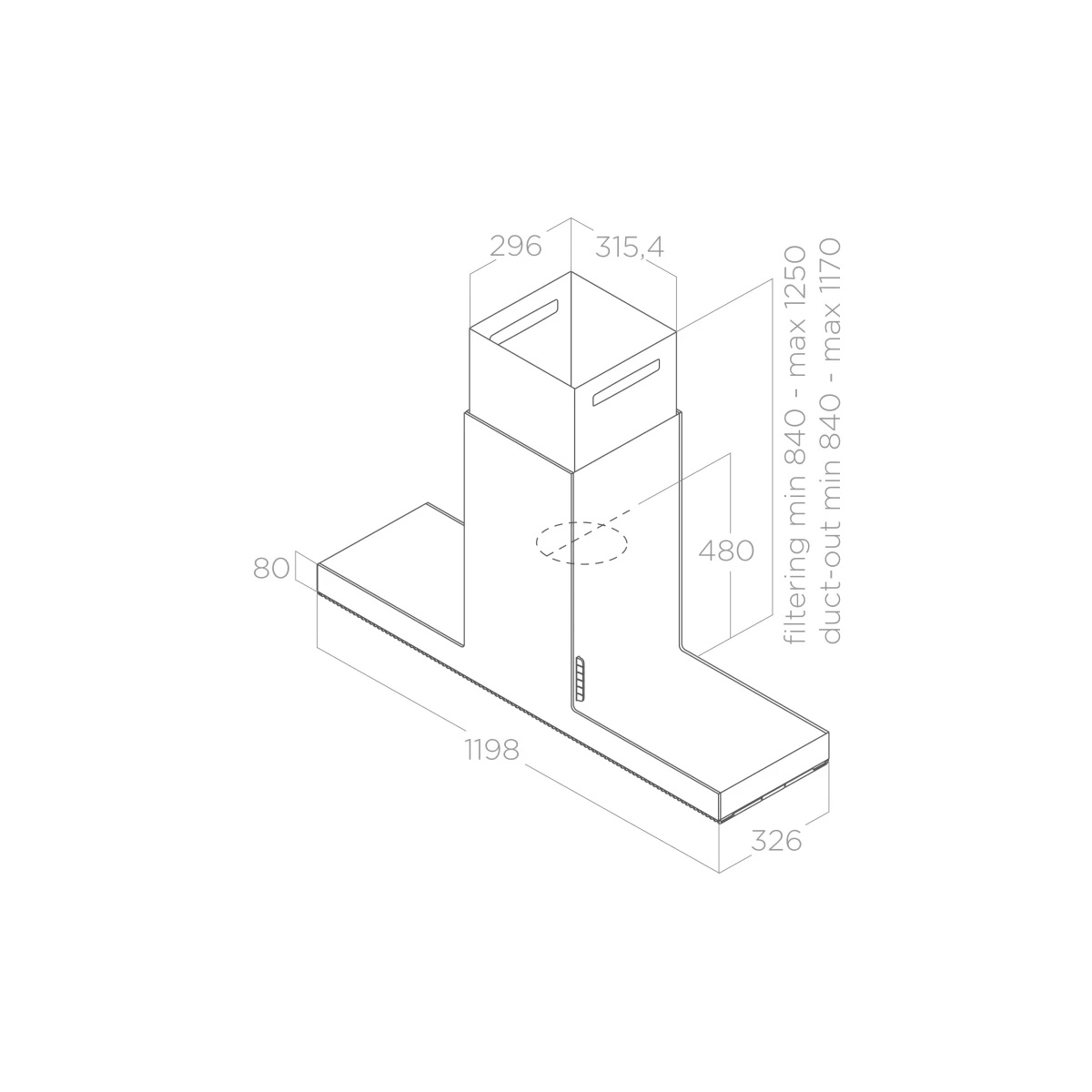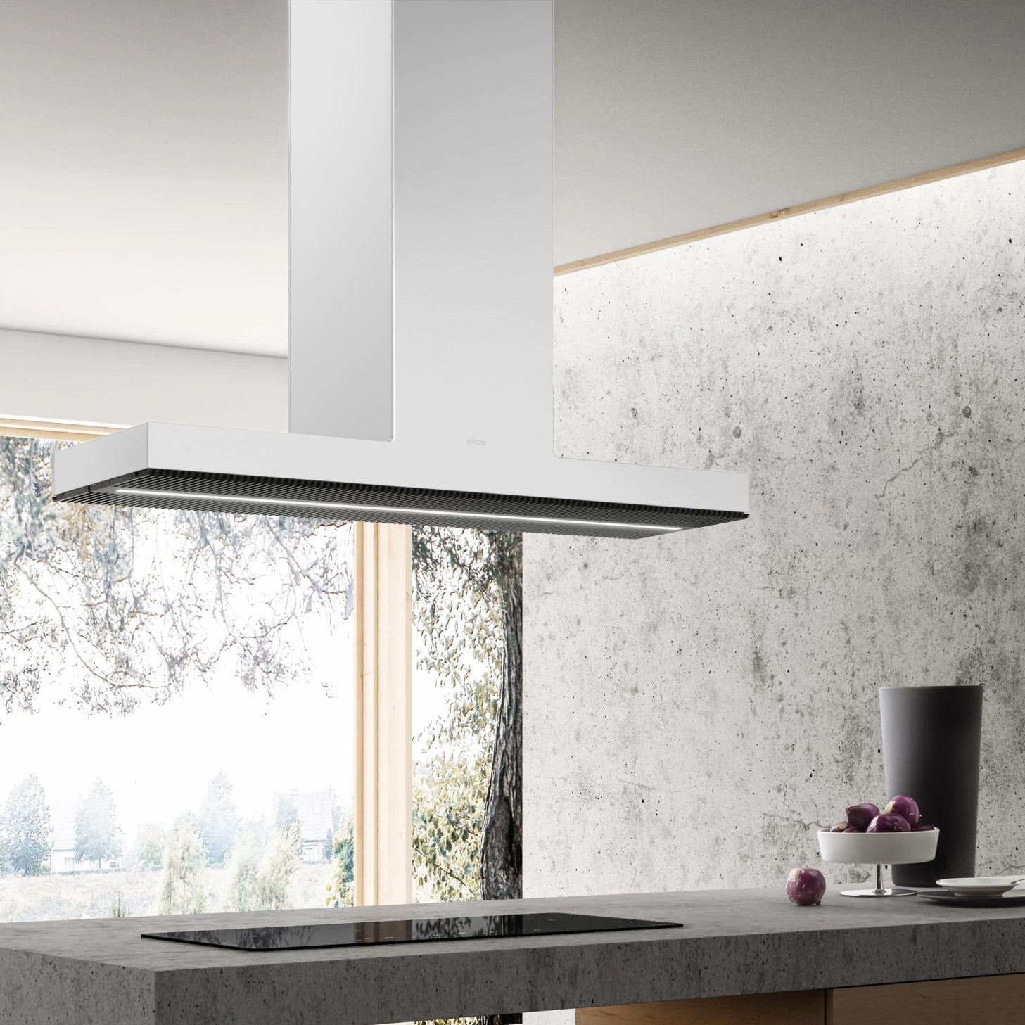 Okap wyspowy w biały Krion. Projekt o charakterystycznym i rewolucyjnym wyglądzie, łączący podstawowe linie i najnowocześniejsze materiały. Korpus okapu i komin są idealnie wyrównane, bez żadnych przerw, tworząc jedną krawędź, która definiuje całe urządzenie. Wersja wyciąg, 690 m³/h, 120 cm.