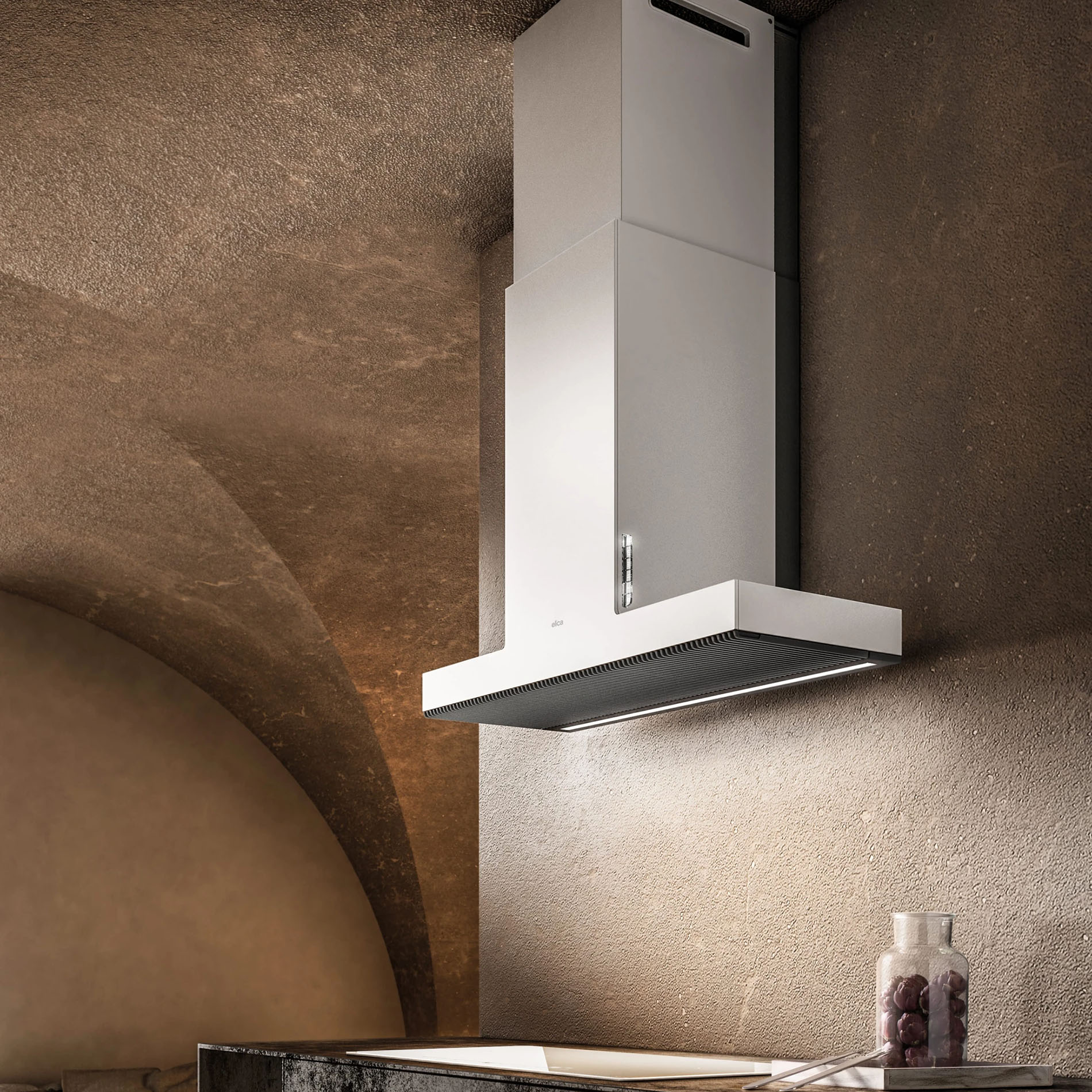 Okapy Elica można instalować w różnych konfiguracjach. W modelach wyposażonych w funkcję Back Aspiration możliwe jest obrócenie silnika i bezpośrednie połączenie okapu z wylotem wentylacji w ścianie. Unikalna konstrukcja okapu pozwala na wykonanie wylotu w ścianie przez wygięcie rury odprowadzającej powietrze pod kątem 90 stopni. Taki układ zapewnia maksymalną siłę zasysania oparów, zachowując oryginalną estetykę okapu, która nie zostanie zakłócona przez dodatkowe instalacje, np. komin.