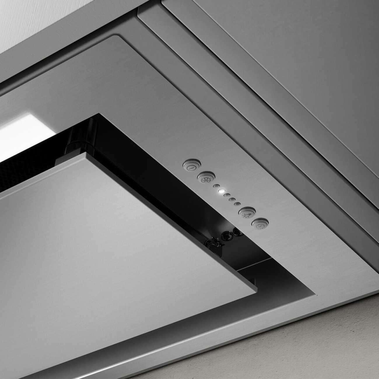 Strefa pochłaniania oparów staje się niewidoczna. System pochłaniania jest rozprowadzany na całym obwodzie okapu, maksymalizując jego skuteczność. Silnik okapu jest doskonale ukryty za panelem, co zapewnia doskonałą estetykę.